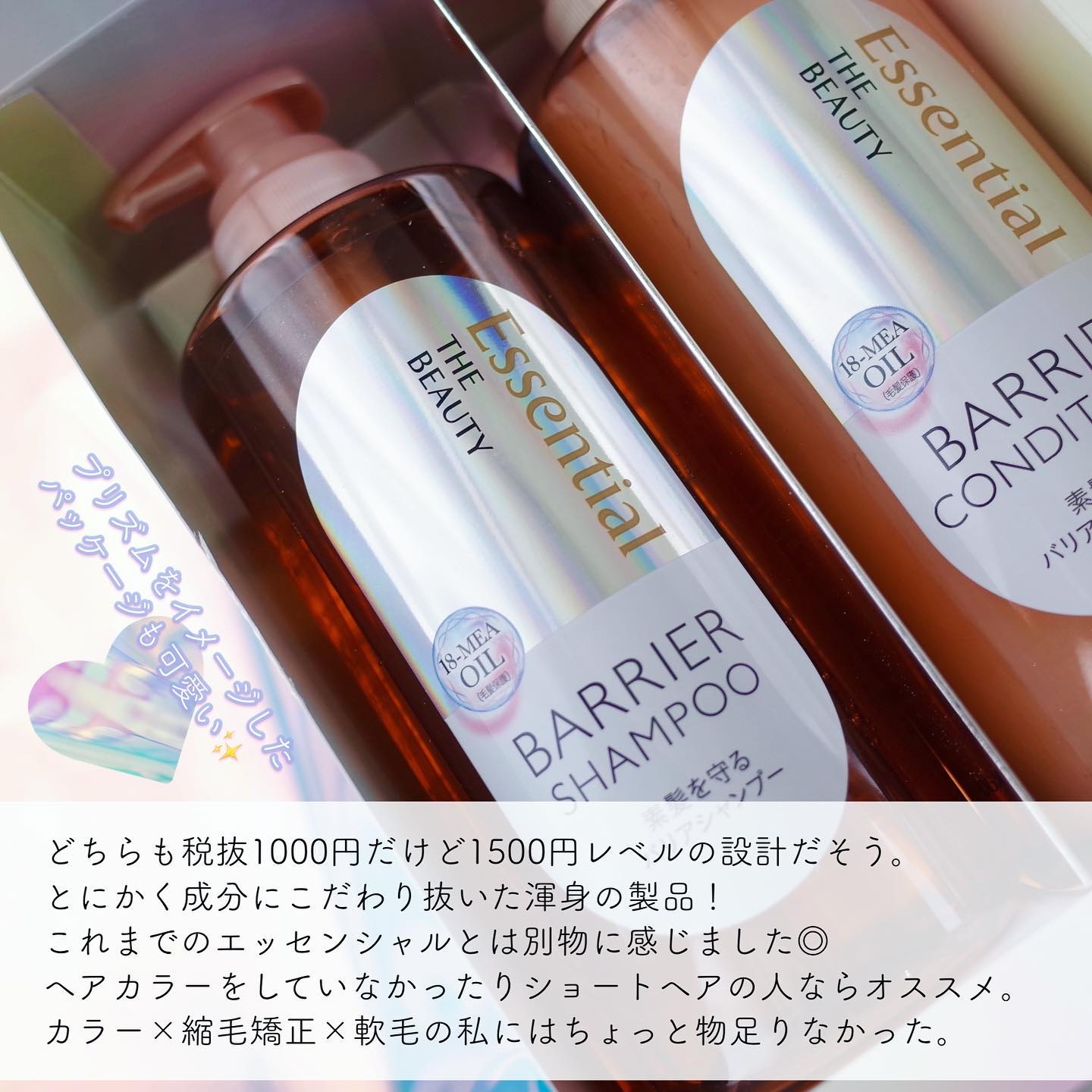 エッセンシャルプレミアムバリアシャンプー・コンディショナーシルキー&スムース〈説明〉・シャンプー・コンディショナー・450ml(両方とも)〈感想〉ホワイトピーチ&ムスクの香りは良い匂いで良かったです。シャンプーの洗浄力には私的には満足しました...