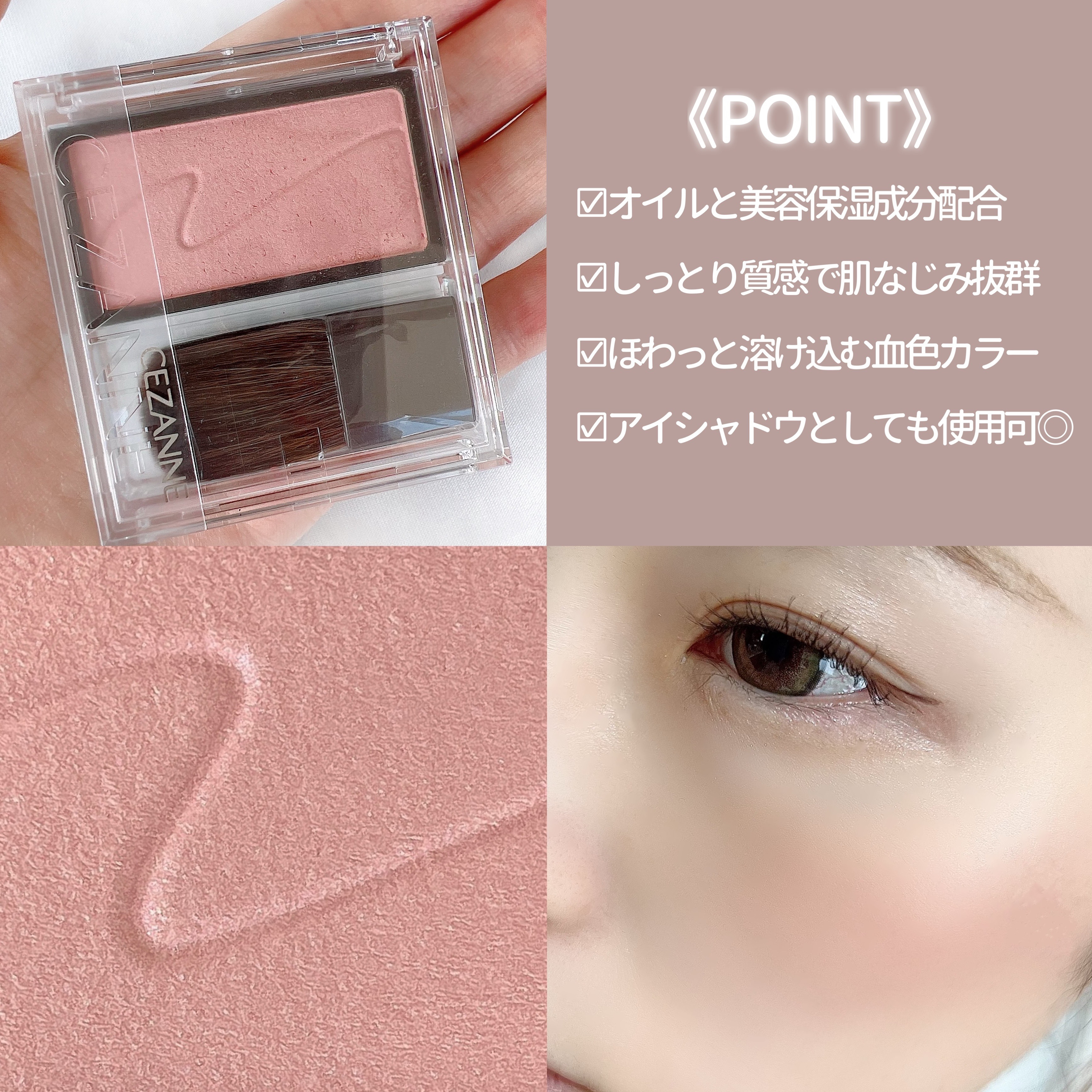 粉質がよく、ふんわり自然に発色! しっとりしていて、浮くことなく肌になじみます☺️ ツヤ感もほどよく、本当に内側から血色感が滲み出たようなほっぺたに✨ この質で550円は凄いですセザンヌさん🥹👏