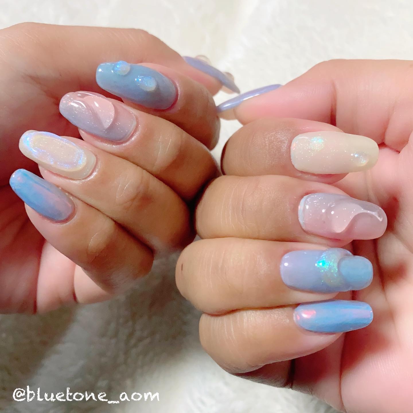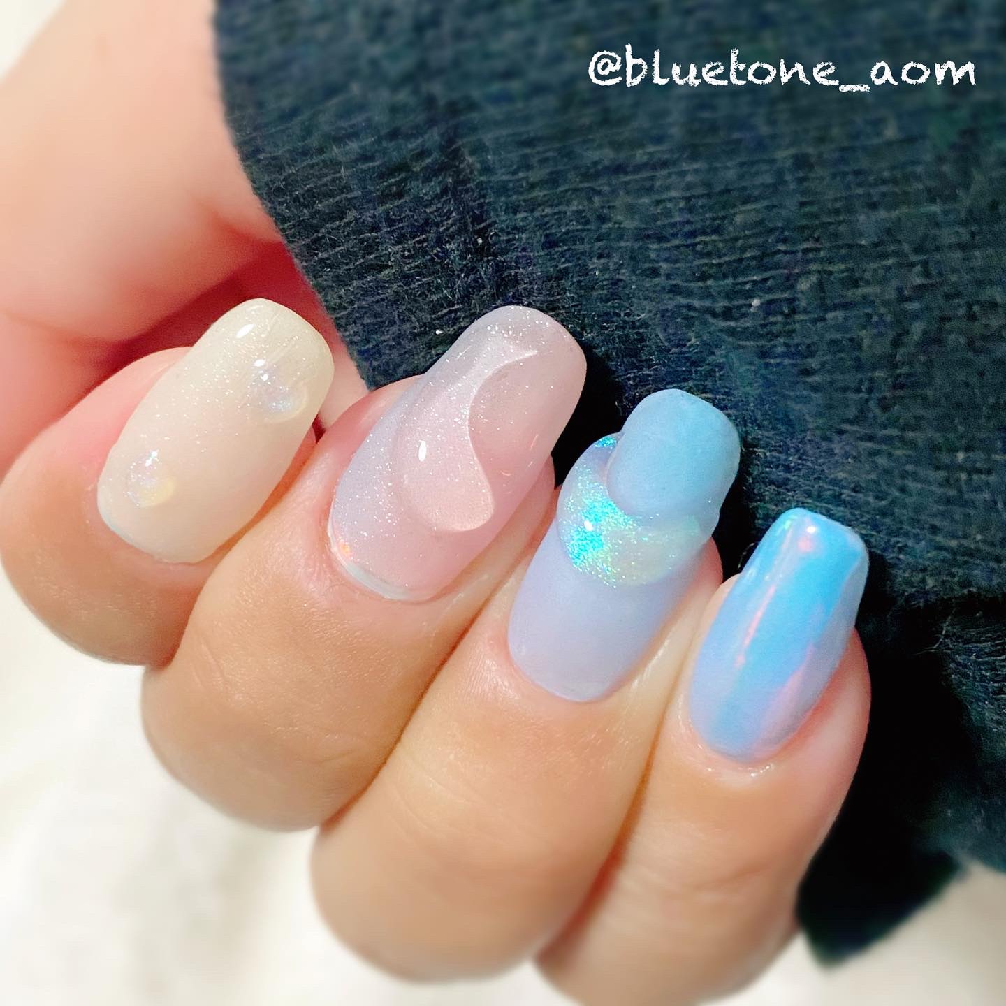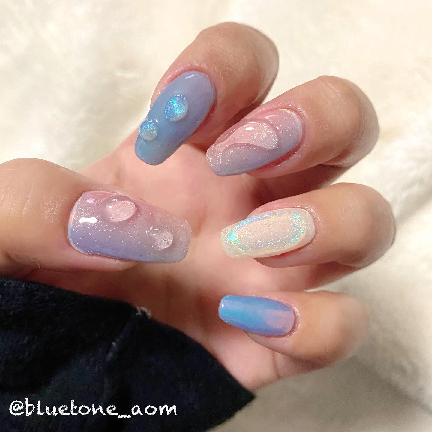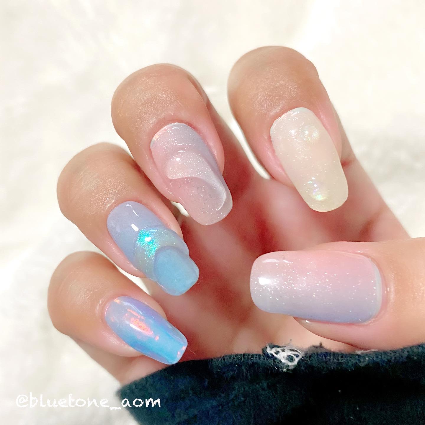 ラメがしっかりしてるし クリアカラーが入ってるから オーロラパウダー無しでも 充分キラキラしました! 反射強めのフィルムなので 実物はもっと うるうるとキラキラが強いです! ビー玉みたい🥺 ネイルシール長持ちさせたいけど ちょっと飽きてきたな〜って時とかに 全然違った印象になるのでオススメです! Seriaのベースジェル 本当にうるうるネイルしやすいので オススメしたい🙆♀️