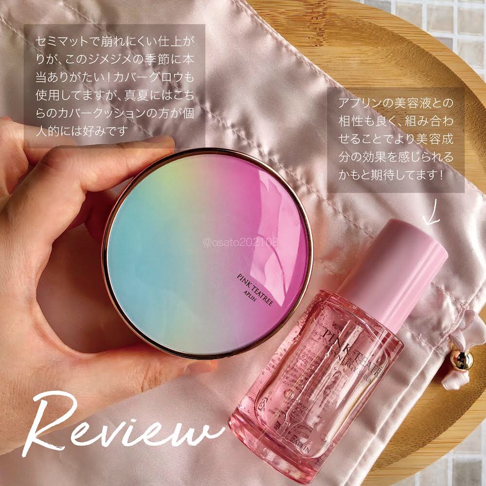 APLIN ピンクティーツリーカバークッション 21号ライトベージュ 2,490円(税込) 少量でよく伸びてハイカバー! 赤みやくすみをしっかりカバ一できるのに、厚塗り感のないなめらかな仕上がり♡ ハイカバーなのにナチュラルなツヤ感とサラッとしつつ、乾燥崩れしにくい仕上がりに感動します!!