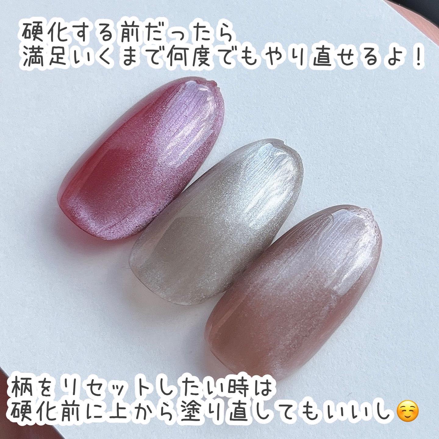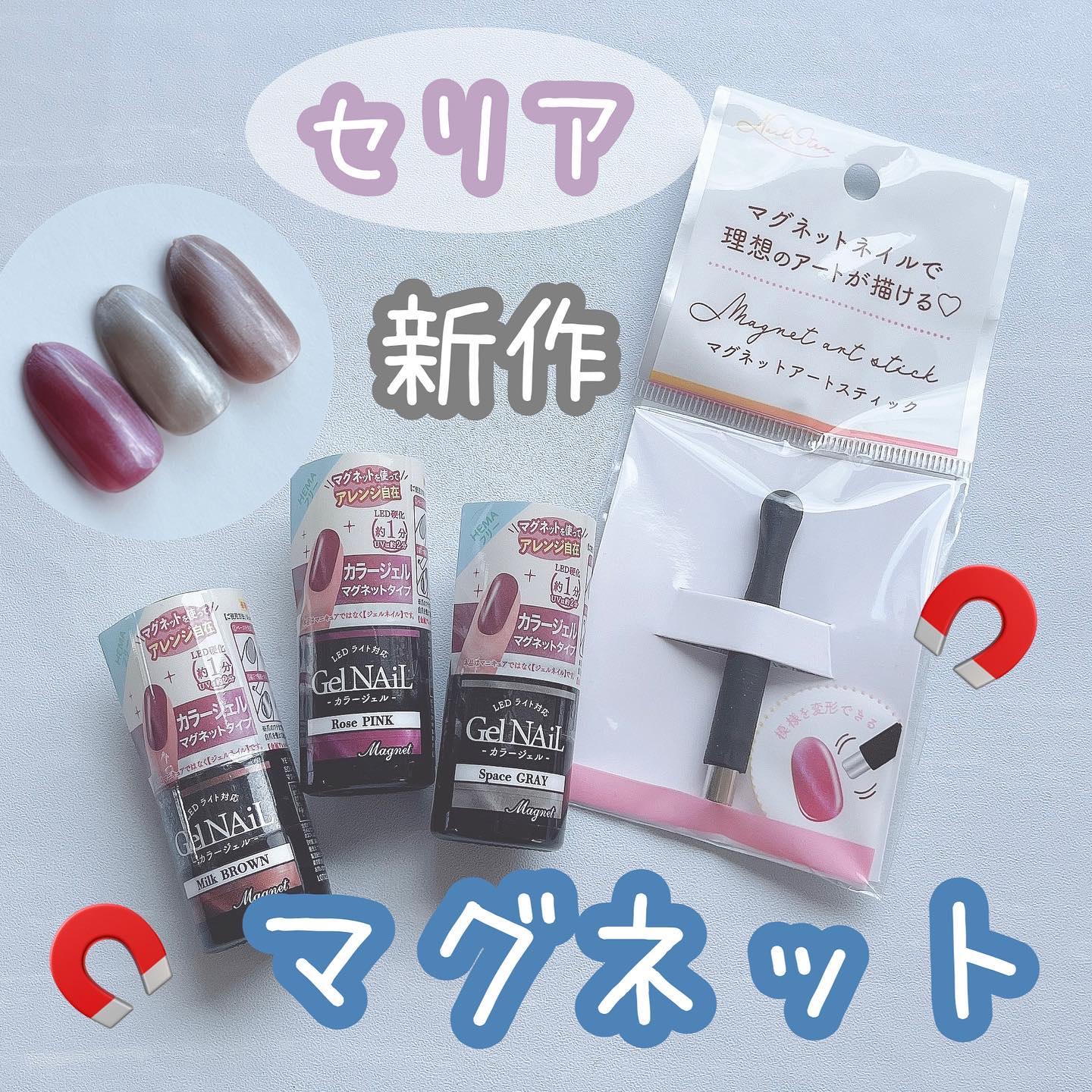 マグネットも同時発売別売りで、 マグネットは1つ100円(税別) マグアートジェルは1本300円(税別)だよ!! マグネットをあてるときらめきが増してすっごくかわいい🥰 そのままでも超超かわいいし、 セリアジェルの『ユニコーンホワイト』とあわせづかいでまた雰囲気が変わるから是非やってみてね!!
