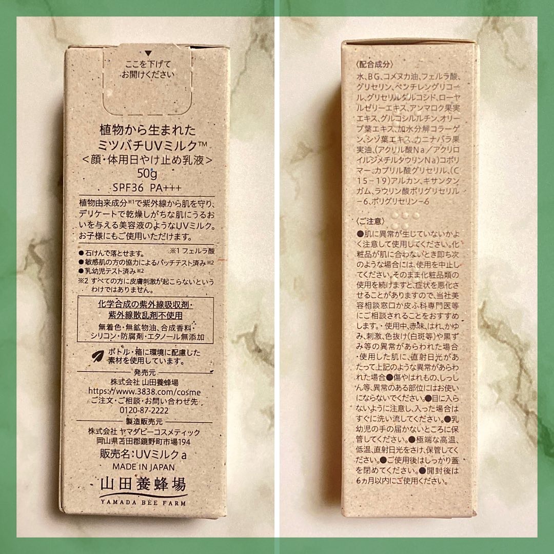 - 環境配慮も美容成分も、もちろん肌へのやさしさも。 自然と人を想い植物から生まれた顔・体用日焼け止めです。 希少なコメヌカ由来「フェルラ酸*」を採用し、化学合成の紫外線吸収剤も紫外線散乱剤も使用せず、植物の力でSPF36・PA+++を実現。これに加え、独自開発の「デセン酸含有ローヤルゼリーエキス**」と「コメヌカオイル**」を配合し、UVカットと、美肌ケアを両立しました。さらに 5 つの天然美容成分を配合し、美容成分 89%を叶えたエッセンスミルクのような使い心地のUVミルクです。 *整肌成分 **保湿成分