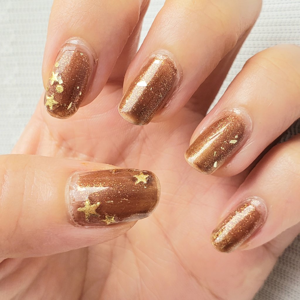 今日のネイル💅 星ネイルはポップな印象になりがち、って偏見があるので、ブラウンベースで大人っぽい感じを目指して塗ってみた~ ✼••┈┈••✼••┈┈••✼••┈┈••✼••┈┈••✼ 【使ったもの】 パラドゥミニネイル BR08 松 ちふれ 017 paプラス ピールオフベースコート plus05 ネイリスト クイッククリスタルコートⅡ ネイルシール(ワッツにて購入) 【やり方】 1.パラドゥミニネイルBR08松を2度塗り 2.クイッククリスタルコートⅡを1度塗り 3.シールを貼る 4.ちふれ017を1度塗り 5.トップコートで仕上げ 🔹ポイント シールの上からラメを塗ったら、奥行き感が出るかなーと思ってやってみたけど、星のシールが見づらくなるだけだった(笑) ちふれ017は大きめのクラッシュホロが入っているから、シールは最後の方が良かったかな。 ✼••┈┈••✼••┈┈••✼••┈┈••✼••┈┈••✼ 昨日は友達とDVDを持ち寄って映画鑑賞会✨ あれこれ話して超盛り上がった(((o(*゚∀゚*)o))) 今日は何をして過ごそうかなー #セルフネイル #ネイル記録 #鮮やか夏ネイル