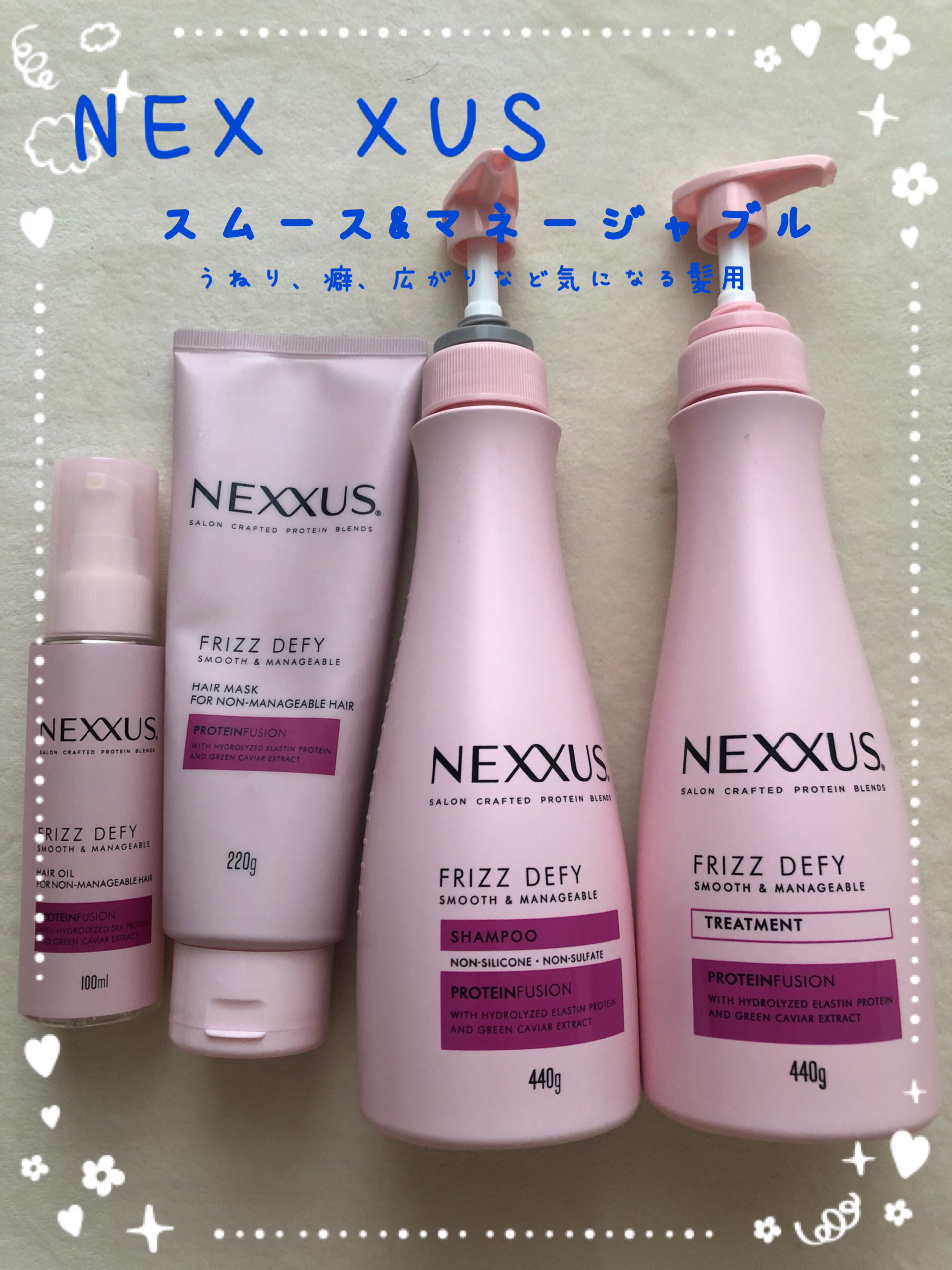 くせ毛、ダメージ、パサつきが常に悩みです。1度買ってみて、自分の髪にとても合ったのでリピしてます😊普段ドライヤーで乾かした後、髪が爆発しがちだったのが、落ち着く様になりました。香りも好き♥️髪を落ち着かせたい方にはおすすめ✨#NEXXUS#ネ...
