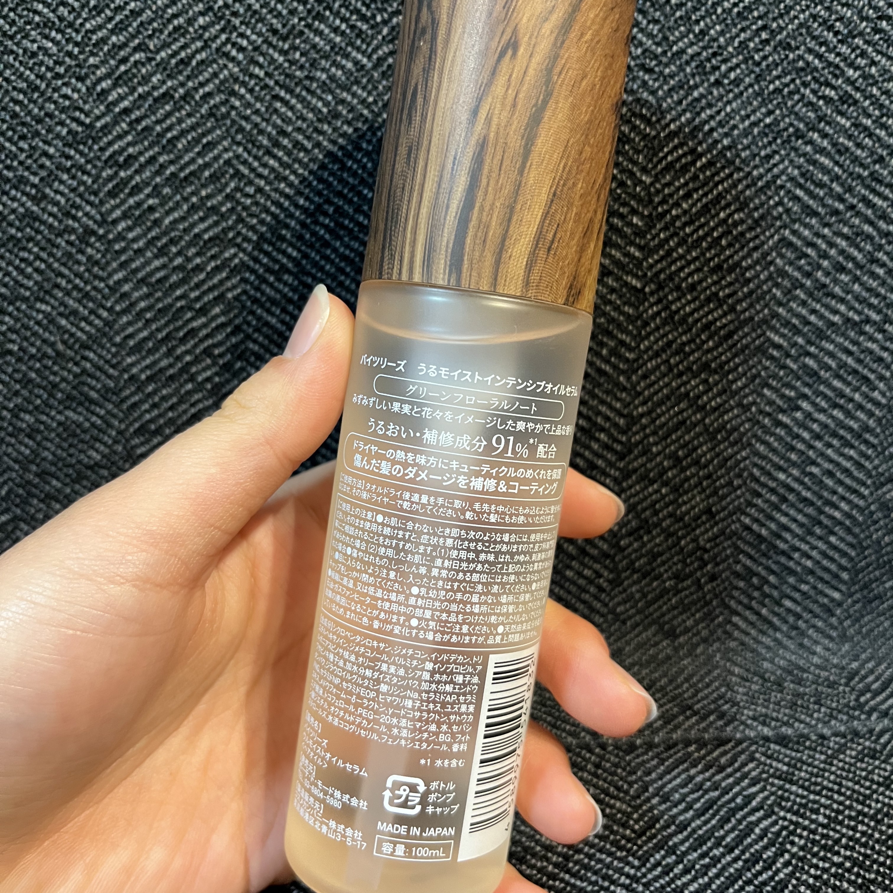 何かとさまざまなプチプラヘアオイルを使用してきたのですが、まず圧倒的な香りの良さに驚きました🤭 高級感のある木目調の蓋とすりガラスのようなボトルがかわいい、、 ヘアオイルはキラキラしたパケが多いため大人っぽさが際立ちますよね😍 また、私が絶賛している香りについてはパケに「グリーンフローラル」との記載がありました〜 華やかで、かつ自然で強すぎない香りが私は大好きでした♡♡!! 保湿力が高く、毛先までパサつかないのが特徴です ただあまりモタっとはせず、伸びが良いので使いやすいと感じました うねりやダメージケアについては、悪く言ってしまうとそこそこと言った感じです ただ色々な髪質の方に使っていただきたいとても良い商品のためぜひみなさんお試しください!!