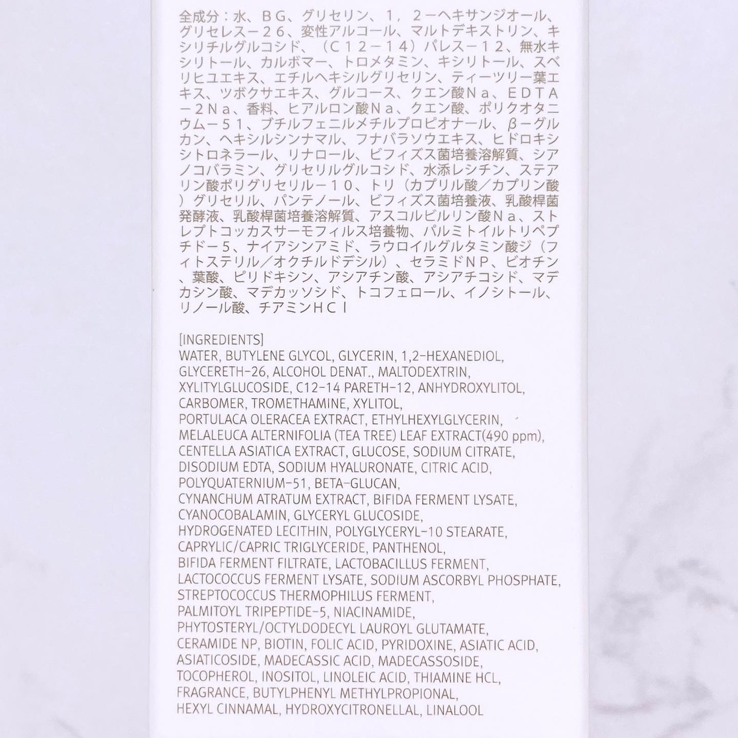 - <50mL> 水、BG、グリセリン、1,2-ヘキサンジオール、グリセレス-26、変性アルコール、マルトデキストリン、キシリチルグルコシド、 (c12-14)パレス‐12、無水キシリトール、カルボマー、トロメタミン、キシリトール、スベリヒユエキス、エチルヘキシルグリセリン、ティーツリー葉エキス、ツボクサエキス、グルコース、クエン酸Na、EDTA-2Na、香料、ヒアルロン酸Na、クエン酸、ポリクオタニウム-51、ブチルフェニルメチルプロピオナール、β-グルカン、ヘキシルシンナマル、フナバラソウエキス、ヒドロキシシトロネラール、リナロール、ビフィズス菌培養溶解質、シアノコバラミン、グリセリルグルコシド、水添レシチン、ステアリン酸ポリグリセリル-10、トリ(カプリル酸/カプリン酸)グリセリル、パンテノール、ビフィズス菌培養液、乳酸桿菌発酵液、乳酸桿菌培養溶解質、 アスコルビルリン酸Na、ストレプトコッカスサーモフィルス培養物、パルミトイルトリペプチド-5、ナイアシンアミド、ラウロイルグルタミン酸ジ(フィトステリル/オクチルドデシル)、セラミドNP、ビオチン、葉酸 ピリドキシン、アシアチン酸, アシアチコシド、マデカシン酸、 マデカッソシド、トコフェロール、イノシトール、リノール酸、チアミンHCI