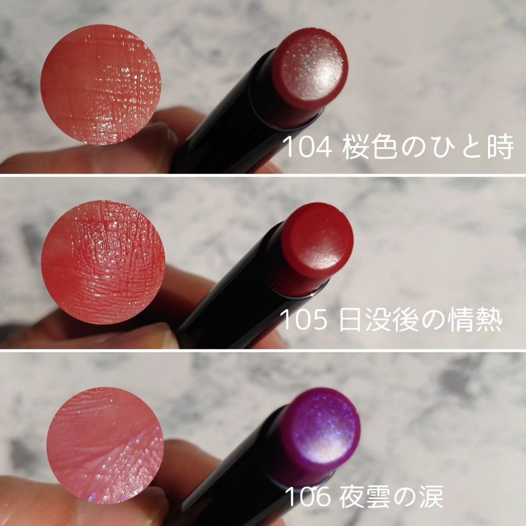 - <01 欲望の塊> テトライソステアリン酸ジペンタエリスリチル、トリ(カプリル酸/カプリン酸)グリセリル、オクチルドデカノール、ラウロイルグルタミン酸ジ(フィトステリル/オクチルドデシル)、ビスアルキル(C16-18)グリセリルウンデシルジメチコン、イソノナン酸イソトリデシル、水添ポリイソブテン、ラウロイルグルタミン酸ジ(オクチルドデシル/フィトステリル/ベヘニル)、パラフィン、合成ワックス、ダイマージリノール酸(フィトステリル/イソステアリル/セチル/ステアリル/ベヘニル)、マイクロクリスタリンワックス、水添マイクロクリスタリンワックス、ヒドロキシステアリン酸エチルヘキシル、トコフェロール、ホホバ種子油、オリーブ果実油、アーモンド油、(エチレン/プロピレン)コポリマー、ポリエチレン、ジメチコン、(+/-)(チタン/酸化チタン)焼結物、マイカ、ラウロイルアスパラギン酸Na、ラウロイルリシン、塩化亜鉛、酸化チタン、酸化鉄、水酸化Al、硫酸Ba、トリイソステアリン酸イソプロピルチタン、酸化スズ、ホウケイ酸(Ca/Al)、合成フルオロフロゴパイト、黄4、黄5、赤104(1)、赤201、赤202 <02 ピンクバナナ> テトライソステアリン酸ジペンタエリスリチル、トリ(カプリル酸/カプリン酸)グリセリル、オクチルドデカノール、ラウロイルグルタミン酸ジ(フィトステリル/オクチルドデシル)、ビスアルキル(C16-18)グリセリルウンデシルジメチコン、イソノナン酸イソトリデシル、水添ポリイソブテン、ラウロイルグルタミン酸ジ(オクチルドデシル/フィトステリル/ベヘニル)、パラフィン、合成ワックス、ダイマージリノール酸(フィトステリル/イソステアリル/セチル/ステアリル/ベヘニル)、マイクロクリスタリンワックス、水添マイクロクリスタリンワックス、ヒドロキシステアリン酸エチルヘキシル、トコフェロール、ホホバ種子油、オリーブ果実油、アーモンド油、(エチレン/プロピレン)コポリマー、ポリエチレン、ジメチコン、(+/-)(チタン/酸化チタン)焼結物、マイカ、ラウロイルアスパラギン酸Na、ラウロイルリシン、塩化亜鉛、酸化チタン、酸化鉄、水酸化Al、硫酸Ba、トリイソステアリン酸イソプロピルチタン、酸化スズ、ホウケイ酸(Ca/Al)、合成フルオロフロゴパイト、黄4、黄5、赤104(1)、赤201、赤202 <03 陽炎> テトライソステアリン酸ジペンタエリスリチル、トリ(カプリル酸/カプリン酸)グリセリル、オクチルドデカノール、ラウロイルグルタミン酸ジ(フィトステリル/オクチルドデシル)、ビスアルキル(C16-18)グリセリルウンデシルジメチコン、イソノナン酸イソトリデシル、水添ポリイソブテン、ラウロイルグルタミン酸ジ(オクチルドデシル/フィトステリル/ベヘニル)、パラフィン、合成ワックス、ダイマージリノール酸(フィトステリル/イソステアリル/セチル/ステアリル/ベヘニル)、マイクロクリスタリンワックス、水添マイクロクリスタリンワックス、ヒドロキシステアリン酸エチルヘキシル、トコフェロール、ホホバ種子油、オリーブ果実油、アーモンド油、(エチレン/プロピレン)コポリマー、ポリエチレン、ジメチコン、(+/-)(チタン/酸化チタン)焼結物、マイカ、ラウロイルアスパラギン酸Na、ラウロイルリシン、塩化亜鉛、酸化チタン、酸化鉄、水酸化Al、硫酸Ba、トリイソステアリン酸イソプロピルチタン、酸化スズ、ホウケイ酸(Ca/Al)、合成フルオロフロゴパイト、黄4、黄5、赤104(1)、赤201、赤202 <04 パンプキンワイン> テトライソステアリン酸ジペンタエリスリチル、トリ(カプリル酸/カプリン酸)グリセリル、オクチルドデカノール、ラウロイルグルタミン酸ジ(フィトステリル/オクチルドデシル)、ビスアルキル(C16-18)グリセリルウンデシルジメチコン、イソノナン酸イソトリデシル、水添ポリイソブテン、ラウロイルグルタミン酸ジ(オクチルドデシル/フィトステリル/ベヘニル)、パラフィン、合成ワックス、ダイマージリノール酸(フィトステリル/イソステアリル/セチル/ステアリル/ベヘニル)、マイクロクリスタリンワックス、水添マイクロクリスタリンワックス、ヒドロキシステアリン酸エチルヘキシル、トコフェロール、ホホバ種子油、オリーブ果実油、アーモンド油、(エチレン/プロピレン)コポリマー、ポリエチレン、ジメチコン、(+/-)(チタン/酸化チタン)焼結物、マイカ、ラウロイルアスパラギン酸Na、ラウロイルリシン、塩化亜鉛、酸化チタン、酸化鉄、水酸化Al、硫酸Ba、トリイソステアリン酸イソプロピルチタン、酸化スズ、ホウケイ酸(Ca/Al)、合成フルオロフロゴパイト、黄4、黄5、赤104(1)、赤201、赤202 <05 ダークフィグ> テトライソステアリン酸ジペンタエリスリチル、トリ(カプリル酸/カプリン酸)グリセリル、オクチルドデカノール、ラウロイルグルタミン酸ジ(フィトステリル/オクチルドデシル)、ビスアルキル(C16-18)グリセリルウンデシルジメチコン、イソノナン酸イソトリデシル、水添ポリイソブテン、ラウロイルグルタミン酸ジ(オクチルドデシル/フィトステリル/ベヘニル)、