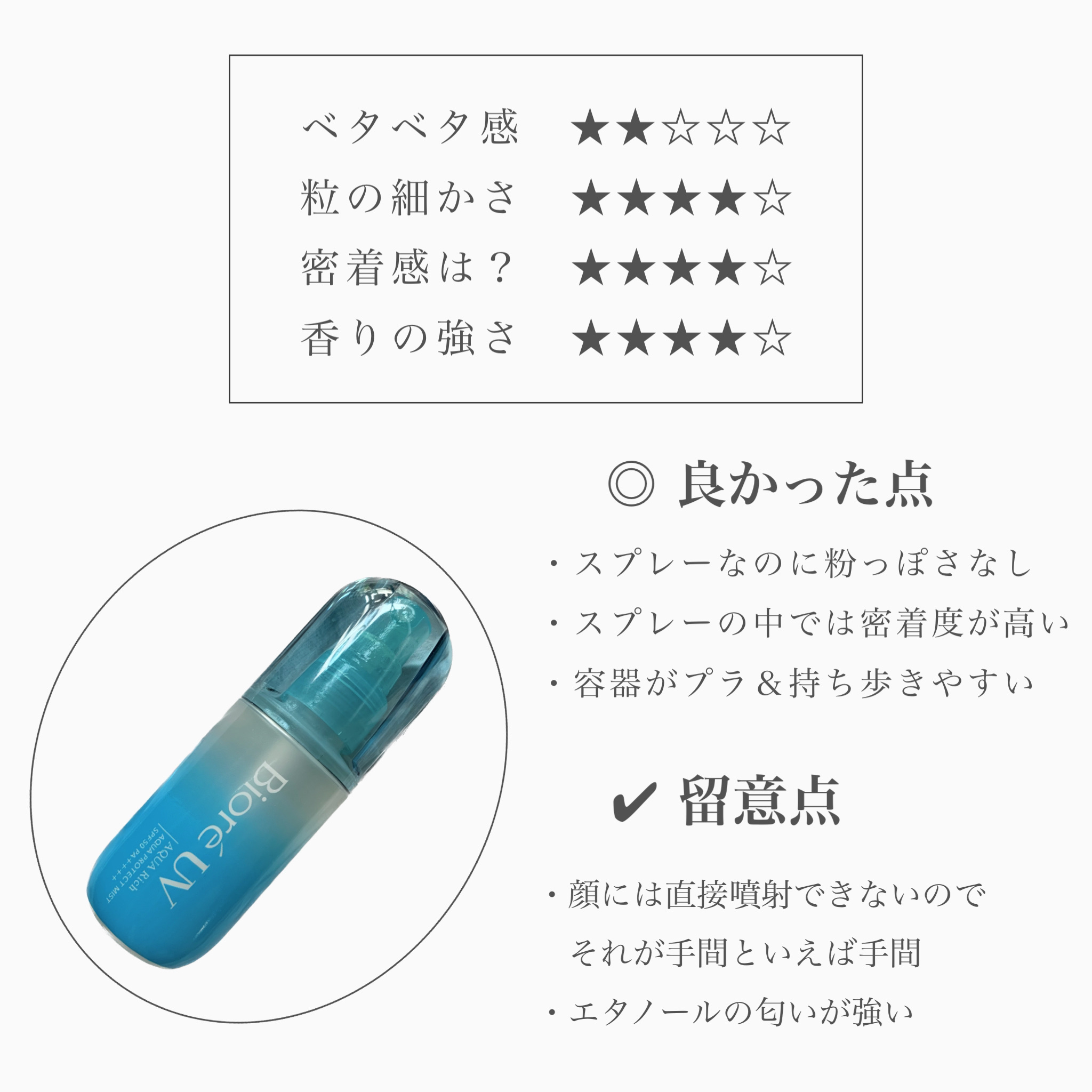 少し前にKaoさまの、Kaoコレモ!のキャンペーンでいただきました。ビオレビオレUVアクアリッチアクアプロテクトミスト顔、からだ、髪に使えます。霧のような細かいミストでした。体に使う場合は10~15cm離してまんべんなくかけます。顔に使う場合...
