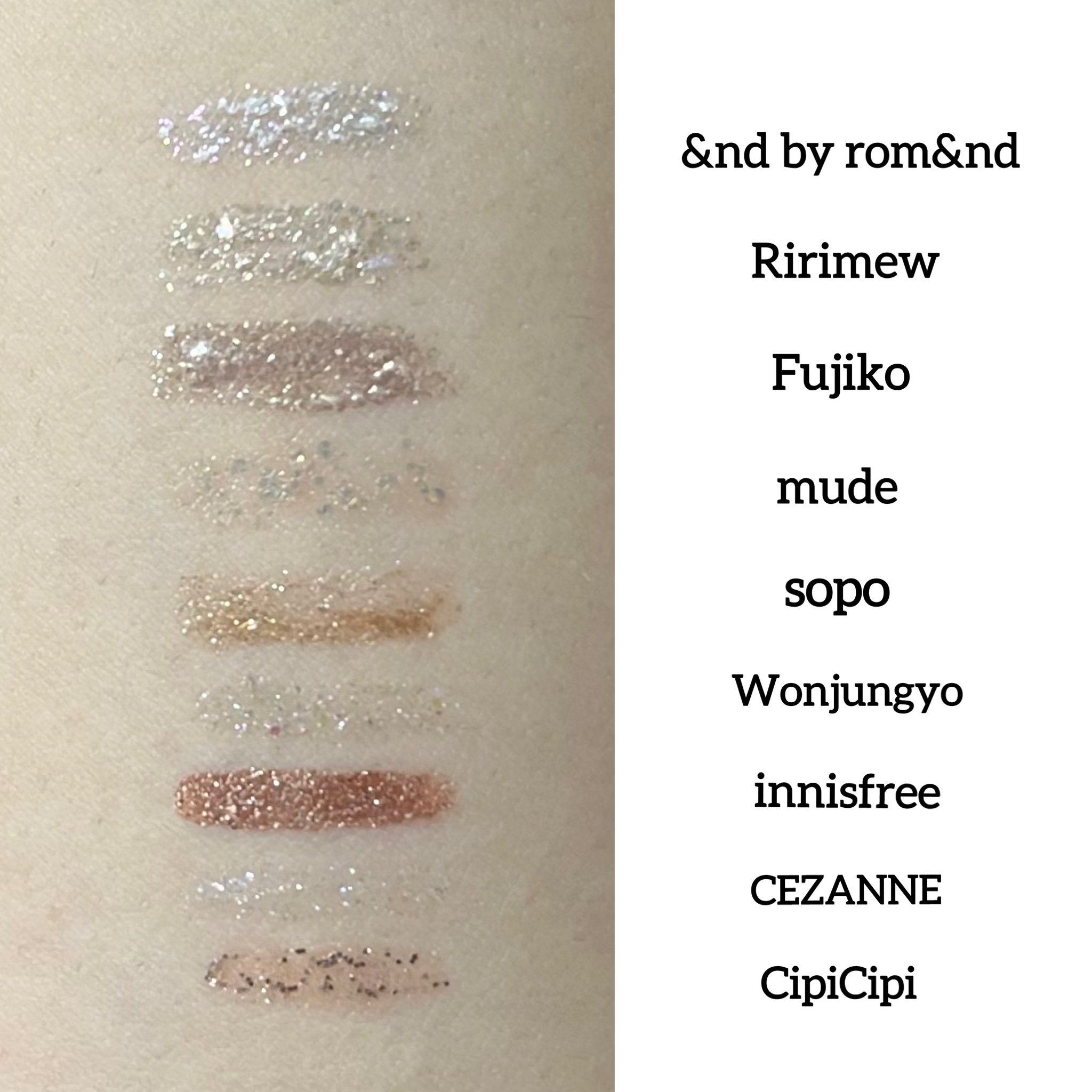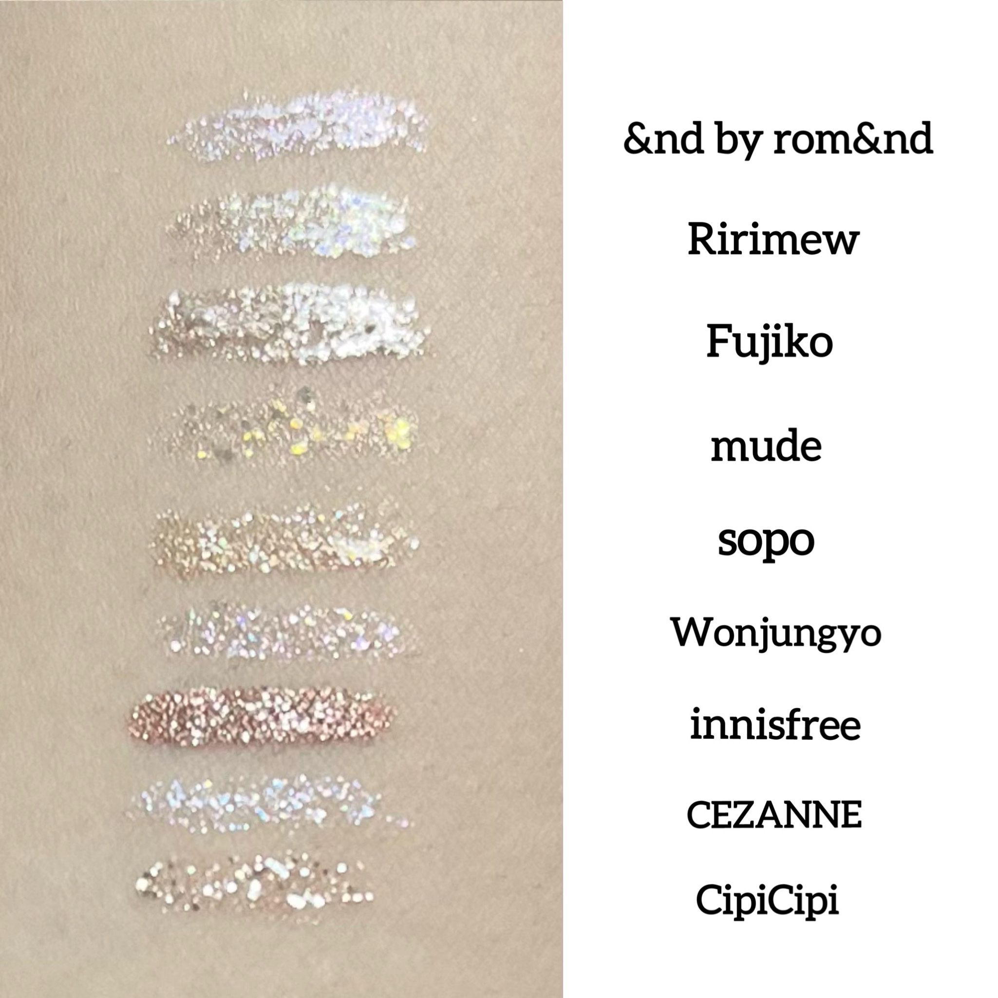 パッと見シルバーに見えますが、ピンクと青のラメもちらちら光る、涼しげで凛としたかわいさ🎐♡ 肌馴染みのいいベージュグリッターかと思いきや大粒ラメも入っており、意外と主張します😳‼︎ ピンクベージュ系ですが、輝きが強くも美しい、、、どこにいても確実に光を集めてくれます🥺💖 コーラルというよりオレンジ系のグリッターに感じます。大粒のオレンジラメは存在感があって目立ちます🤩 ブラウンベースにゴールドラメで、ヘルシーな雰囲気を出せるグリッターです😉🤎 以前使っていたrom&ndグリッター03と似ていますが、こちらには大粒ラメがないのでより使いやすいです❤︎ 赤みブラウンベースにシルバーラメが詰まっています。黒目下の目のキワにのせると、目力がアップします🙆♀️ 超ナチュラルなのですが、小粒の多色ラメたちがさりげなくチラチラするのがたまりません、、 ベースカラーは血色感を与えてくれるほんのりピンクで、シルバーにもベージュにも見えるラメが入っています。