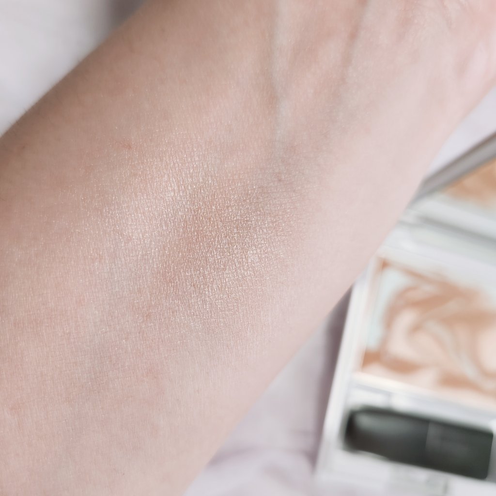 ベージュでこんな可愛くなれるんだと感動したラメ感と発色 肌に溶け込む分、どんな風に塗っても失敗しないし、自然に掘りが深い感じの目元になれる👍 ガラスパールのラメとほんのりコーラルがかったベージュで馴染みすぎず、抜け感のある雰囲気も出せて絶妙なオシャレ発色✨ ハイライトが偏光と記載があり、かなり発光します💡✨ 繊細なパールで目の下辺りとかは少し毛穴が目立つ感じもあり、マットのフェイスパウダーで調節しつつ使うとちょうど良くなりました🥰 とにかく粉がしっとりなめらかで、色の調節がしやすい❣️ 1色1色の面積もまぁまぁ大きいのでチークブラシでも取りやすく、顔全体に使えて便利🙆 日常使いしたいパレットです💕