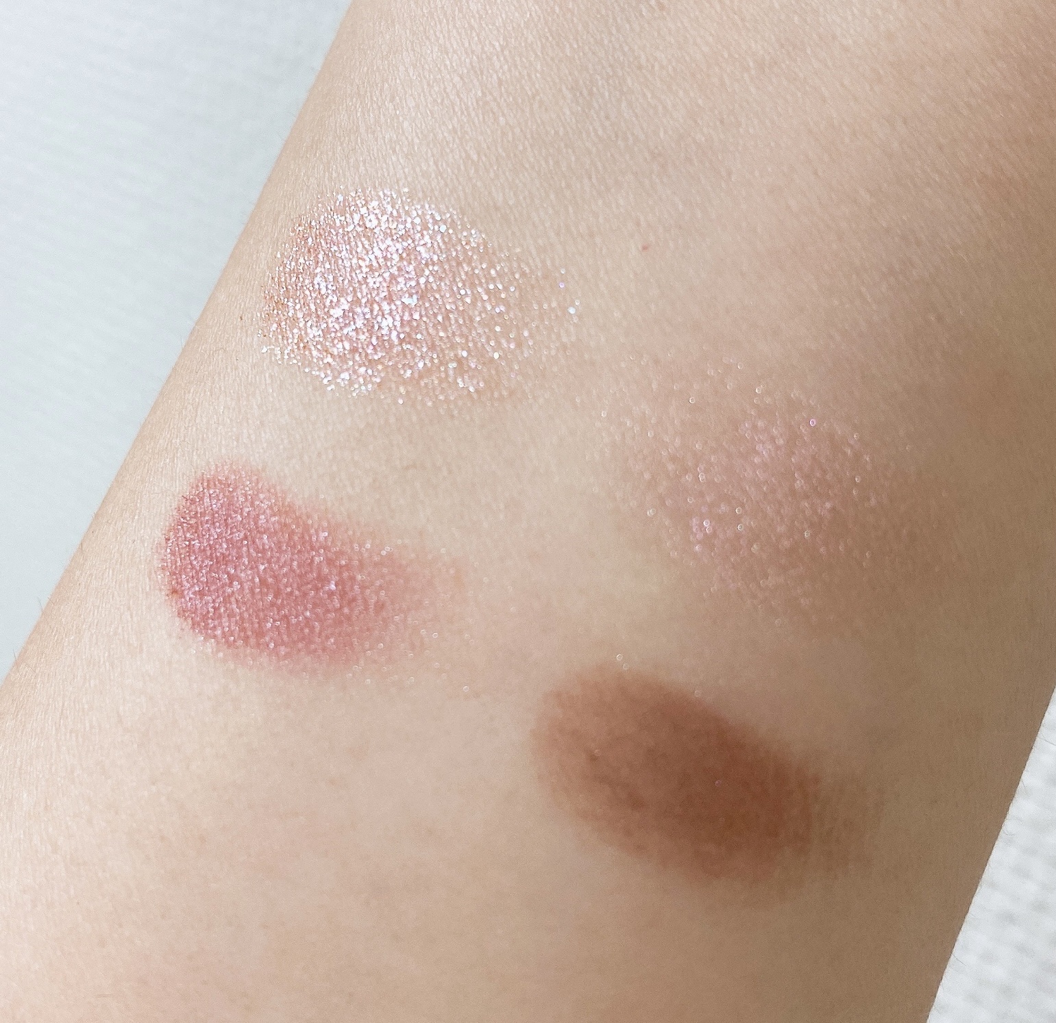 両パレットの上2色は、購入前に画像で見た時にはかなり似てるのかなと思ったけど現物を見ると結構違う! ツヤツヤの質感はどちらも似た印象だけど、ヘイズィセンシュアリティのほうが、ヌード ディップよりも黄味が少なくグレージュかかってる感じ。 そしてヘイズィセンシュアリティ、やっぱりピンクが絶妙で可愛い〜!上品にもカジュアルにもハマる! ヌードディップは、やっぱり顔面に立体感が出る〜! もし万が一、手持ちのアイシャドウパレットを3つしか残せないって言われたらヌードディップとヘイズィセンシュアリティをそのなかに入れてしまう気がします。