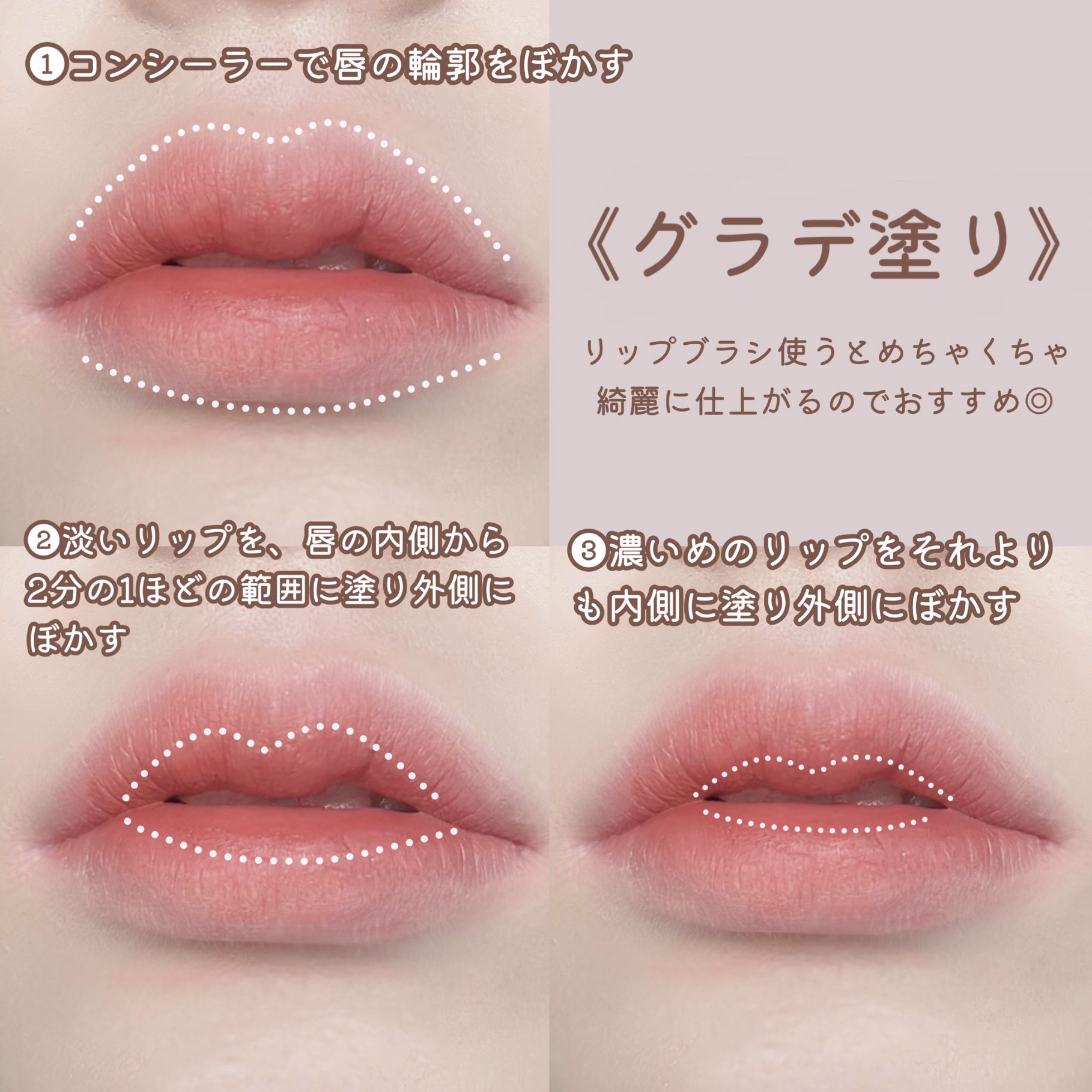唇周りの血色感をコンシーラーで消す コレをすることでグラデーションしやすくなる✌️ 使っているのは 📍LUNAロングラスティングチップコンシーラー/SPF34 PA++ 0.5ポーセリン ¥1,650(税込) 濃いめのリップをハートのような形に塗って外側にぼかすを3回程繰り返す コレをすることでグラデーション出来る! 使っているのは 📍rom&nd ジューシーラスティングティント 17 プラムコーク ¥1,320(税込) 唇上にハイライト入れる コレをすることで立体感出て、よりぷりぷりの唇に見えます👀 使っているのは 📍JUDYDOLL メリハリマスターパレット 02ウォームトーン ¥2,090(税込)