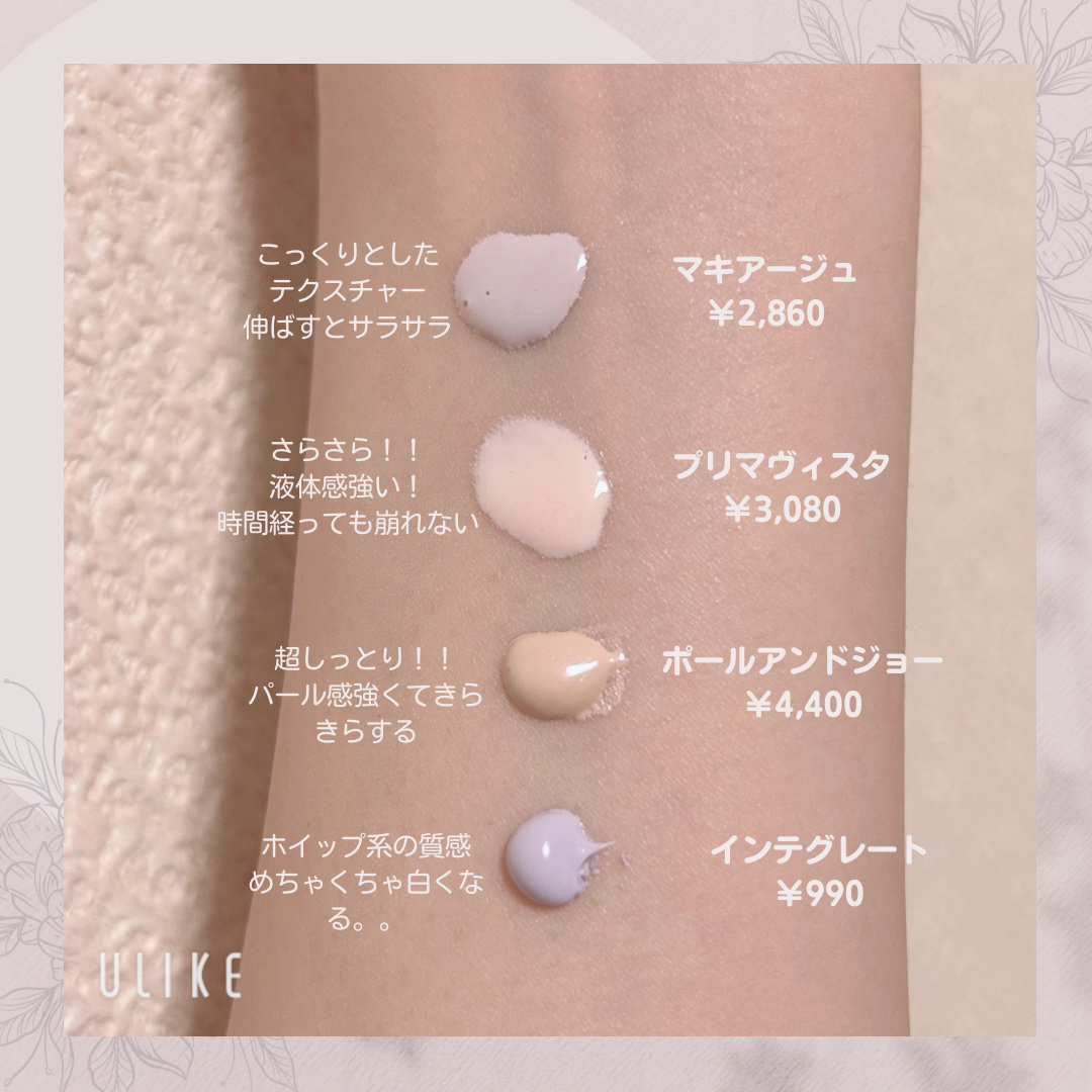 マキアージュ・プリマの下地はSPF50+PA++++の最強日焼け止め効果な上に、崩れにくくて超おすすめです💕 ポール&ジョーはさすがの保湿力、、!!(そして良い香り)パール入りで、ラメキラキラな顔面になれます!!笑 インテグレートはめっちゃ過去に買ったやつを掘り起こしてきました🤣ダントツでトーンアップする&めっちゃ安い!!けど、硬めで塗りにくい、崩れやすいから、リピは無しかも...