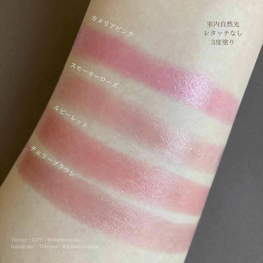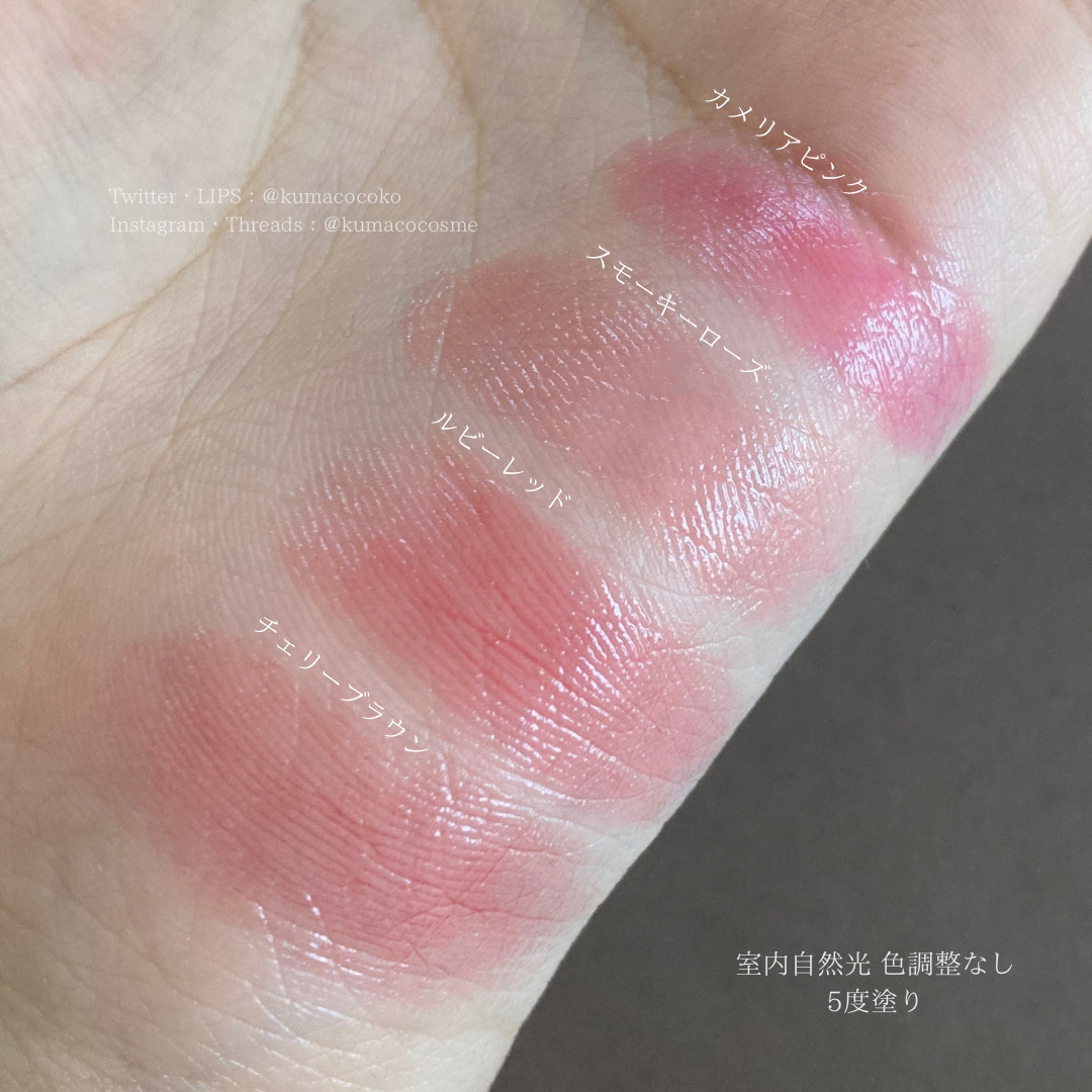 するする塗れて潤うのに高発色、 SPF20 PA++、無香料。 うるみが可愛い反面、 マスクにはつきやすいかも⚠️ 私は単体使いの他に、 同系色のリップ (ティント効果があるものや乾燥しやすいもの) に重ねて保湿を補ったりします🌸 ⚪️カメリアピンク The・青みピンク! うるうる可愛い唇に💕 ⚪️ラズベリーピンク 青みピンクでも大人っぽくお姉さんな色。 発色も良く華やか🙆♀️ ⚪️シアーレッド シアーで強すぎないレッド。 ほどよい血色感がプラスできて、 ヘルシーなメイクが叶う☀️ ⚪️ボルドー 赤みブラウンで使いやすい◎ 秋先にはこれを使いたくなります🍁 公式サイトにはカラーチャートもあり、 バーチャルメイクもできます🤍 カラバリは8色。 お気に入りを見つけやすいかなと思います😉 唇が荒れている時、乾燥気味のときに◎ 常にポーチに入れておきたい。 さっと使える万能リップです💄