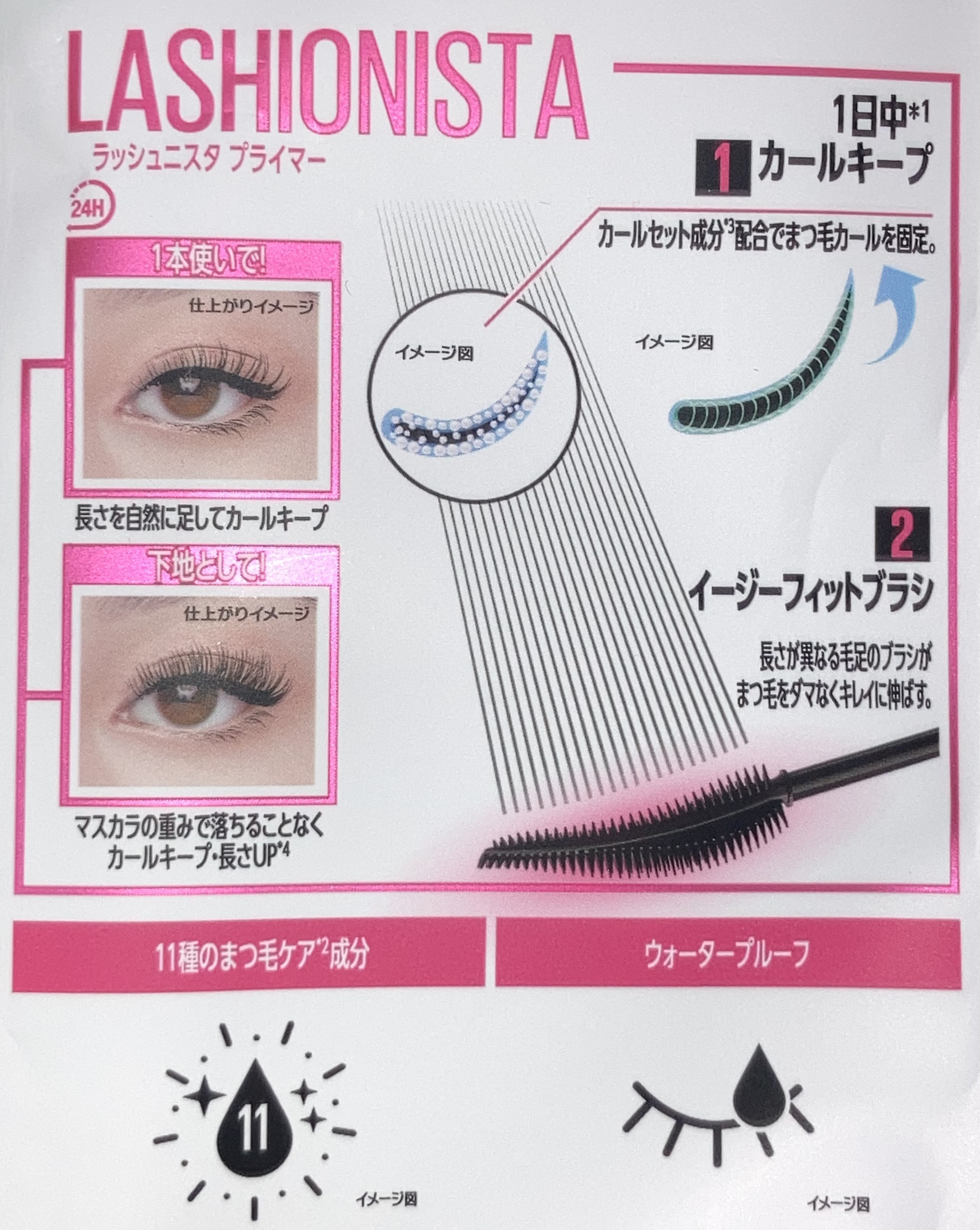 - しっかり カールキープ! 一本でも使える、マスカラ下地。 ①カールセット成分(*1)配合 しっかりカールを固定し、下がりやすい(*2)まつ毛も長時間カールキープ。 ②半透明ブラックで、自まつ毛がそのまま伸びたように(*3)ナチュラルに盛れる。 ③イージーフィットブラシ 長さ異なる毛足のブラシがまつ毛にフィット。 根元からダマなくキレイに伸ばす。 *1 トリメチルシロキシケイ酸(皮膜形成成分)。 *2 メイベリン ニューヨークにおいて。 *3 メイクアップ効果。
