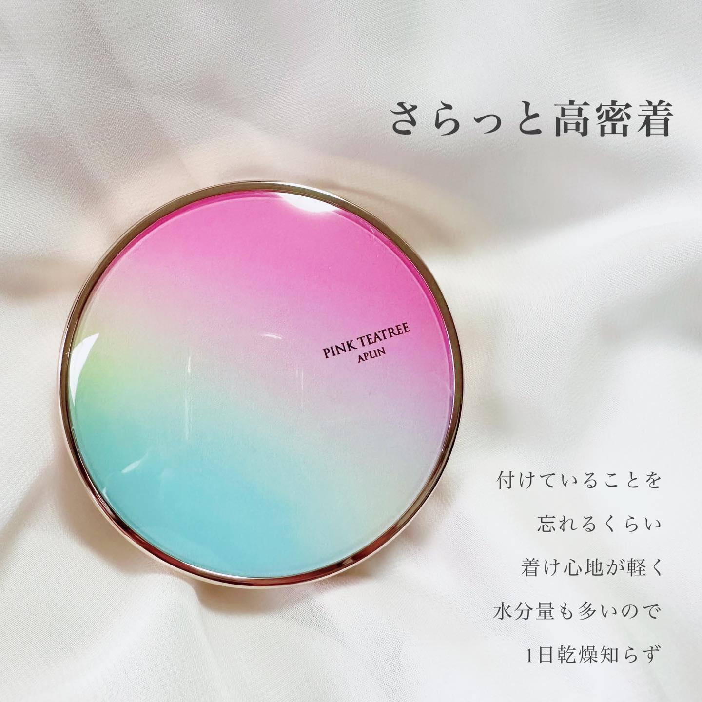 APLIN ピンクティーツリーカバークッション 21号ライトベージュ 2,490円(税込) 少量でよく伸びてハイカバー! 赤みやくすみをしっかりカバ一できるのに、厚塗り感のないなめらかな仕上がり♡ ハイカバーなのにナチュラルなツヤ感とサラッとしつつ、乾燥崩れしにくい仕上がりに感動します!!