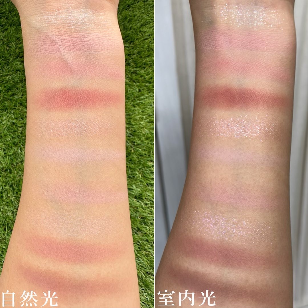 右下のシャーベットのような涼しいブルーがめちゃめちゃ夏っぽくて可愛くないですか?🧡 このバームは陶器肌のような透け感のある透明感を出してくれるんです! アイシャドウは全体的にパール感と超微細なラメの煌めきが強め✨ 今回のアイシャドウはプラザ、ミニプラ限定のアイシャドウで、しかも数量限定になっているので、気になる方は早めにチェックして見て下さい🏃🧡✨