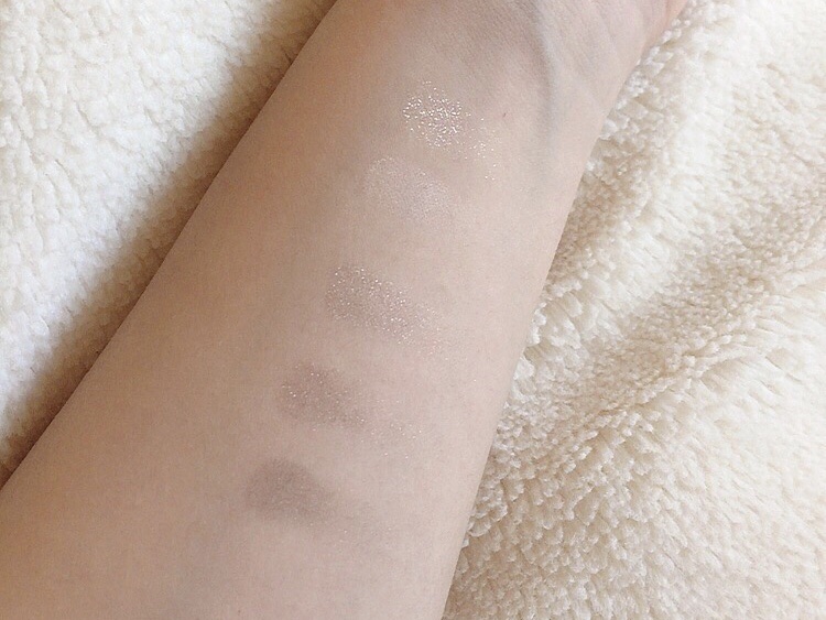 チップで塗るとぼんやりしない 左下の濃い色を控え過ぎず、発色させる! 濃い色の上に左上のラメをキラキラさせる! コントラストが得意なので、上まぶたは左2色をメインにしたほうがスッキリ見えました! 個人的には、右の2色は涙袋に使った方が良いかもと感じました。