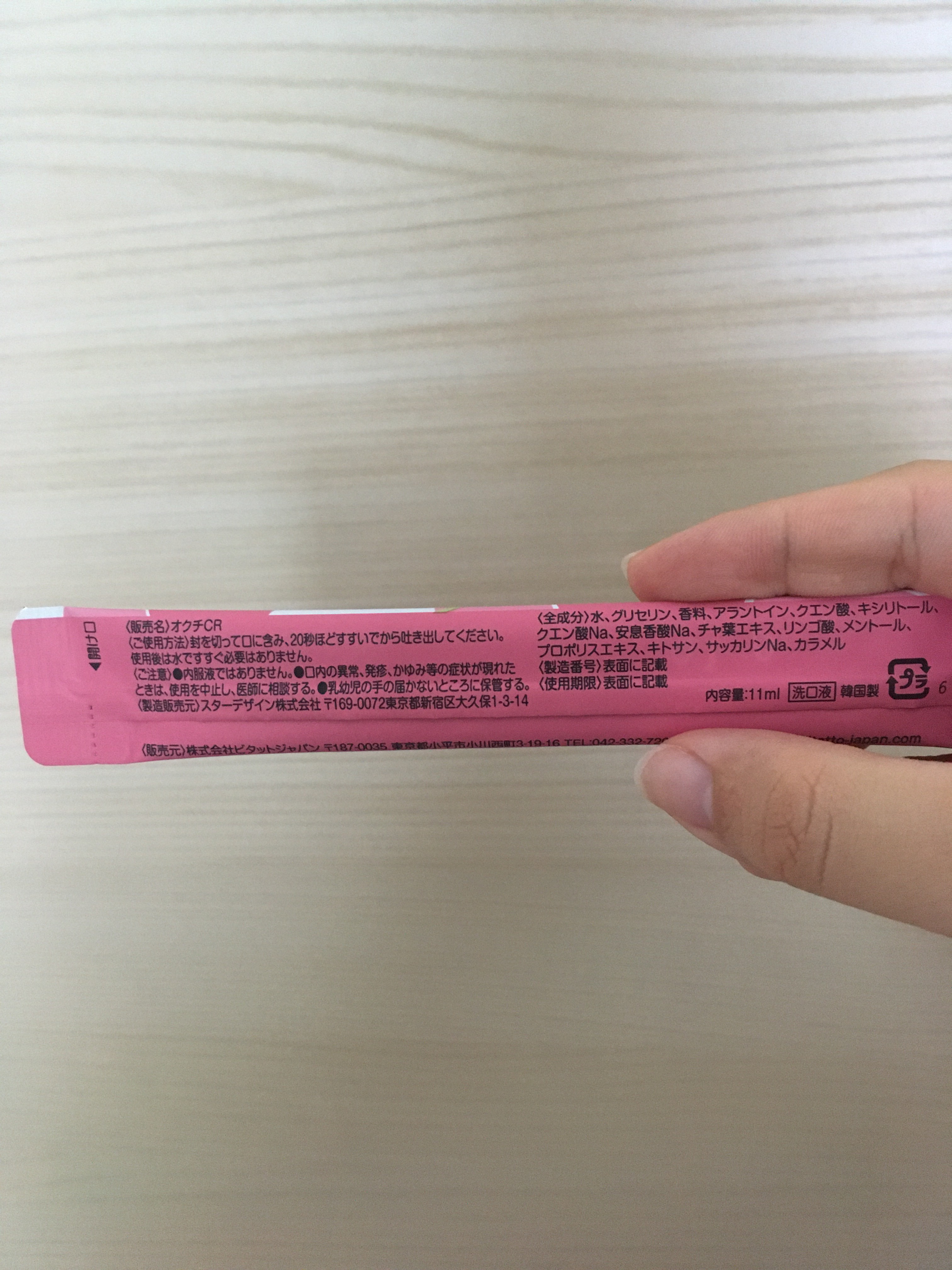 - 水,グリセリン,香料,アラントイン,クエン酸,キシリトール,クエン酸Na,安息香酸Na,チャ葉エキス,リンゴ酸,メントール,プロポリスエキス,キトサン,サッカリンNa,カラメル