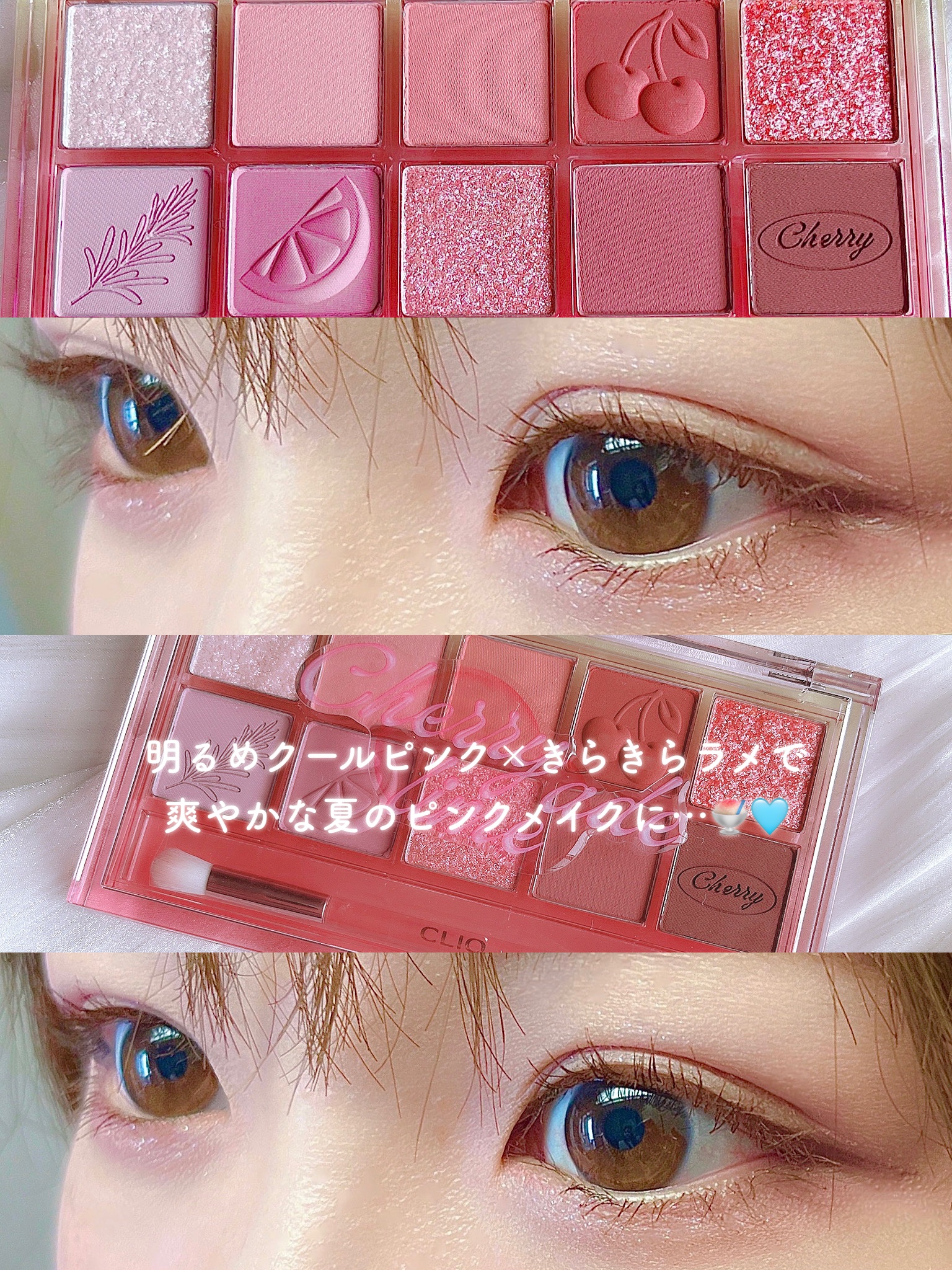CLIOプロアイパレット22CHERRYLIMEADE¥3,740◇質感(マット6、グリッター3、マットパール1)どのカラーも柔らかくしっとりした質感をしています◎グリッターは硬くて取りづらいものも多いですが、このパレットは3色とも柔らかくて...