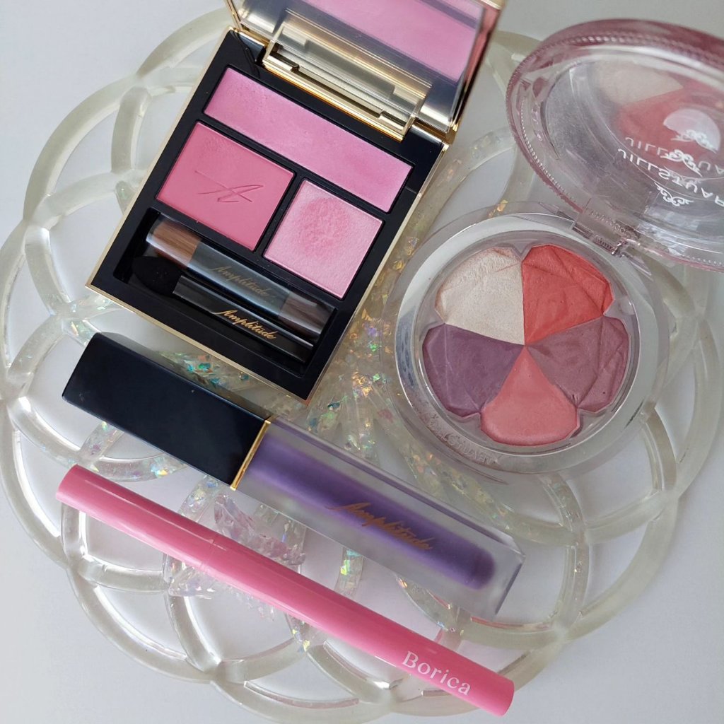 RMKのアイシャドウはこれがデビュー。こんなんブルベホイホイじゃん…。かわいすぎて即予約電話したわ🫠🩷 青みピンクに透明感爆発パープルにキラキララメ。締め色はグレージュっぽいブラウン。ブルベ大歓喜。 発色は調整しやすい。ピンクも見た目はビビッドだけど、ふんわり色づくので、好みの濃さにできるよ。