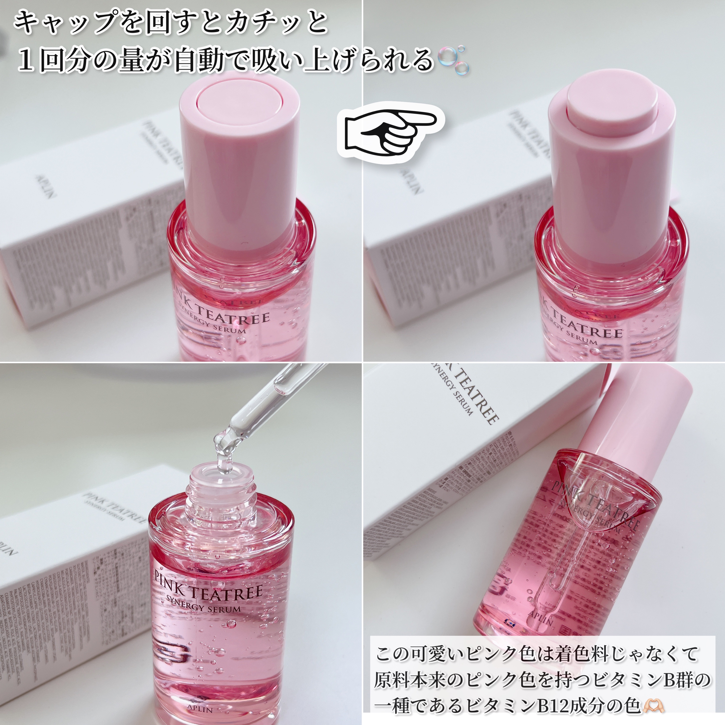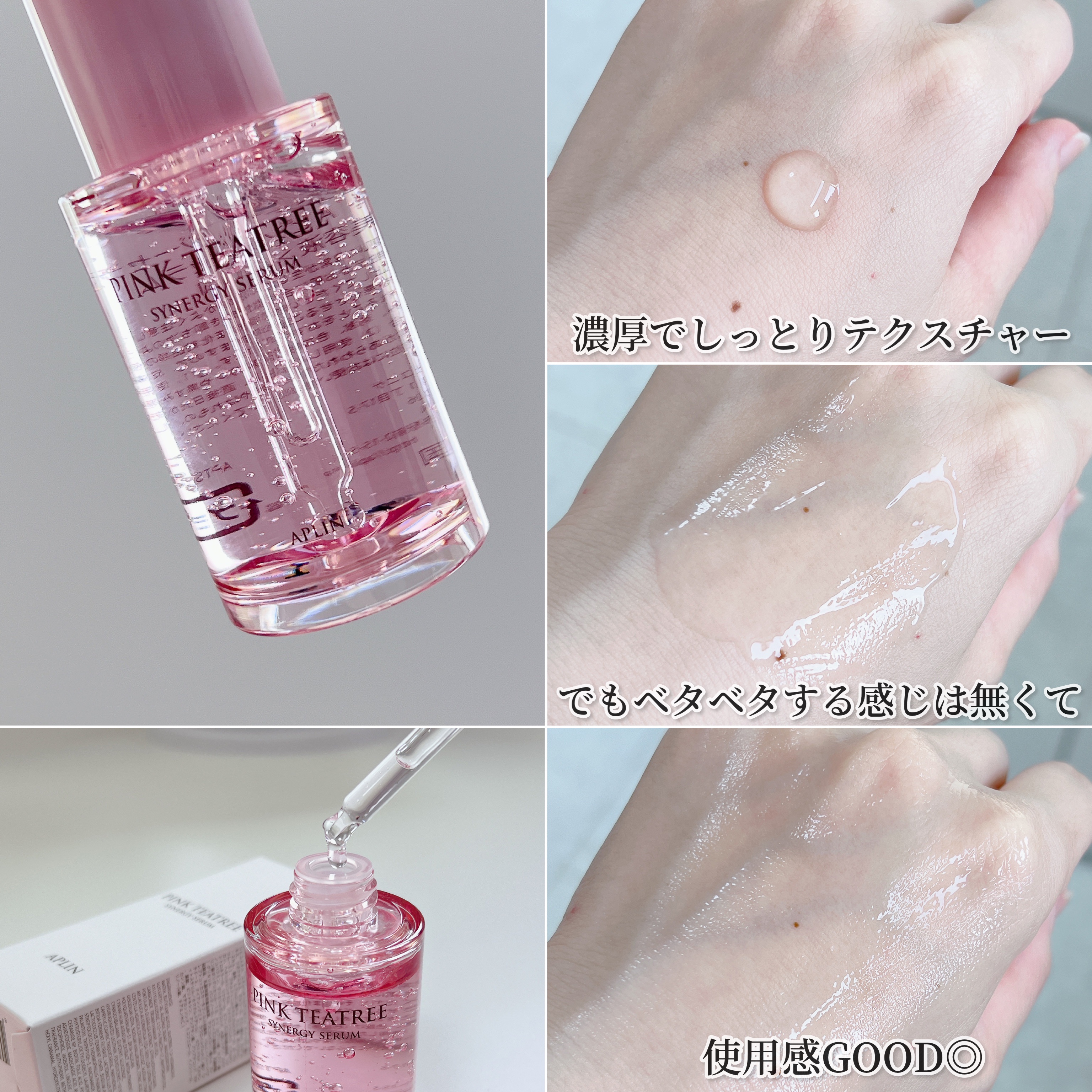 可愛いピンク色のAPLIN第人気のセラム♡ このピンク色は自然成分ビタミンB12によるもので、着色料不使用⚐ ˒˒ ●保湿成分のティーツリーやツボクサ(CICA)エキス配合 →肌荒れの鎮静効果 とろっとした濃厚なテクスチャーですが、スーッと伸びてしっとりもっちりとしたお肌に♡