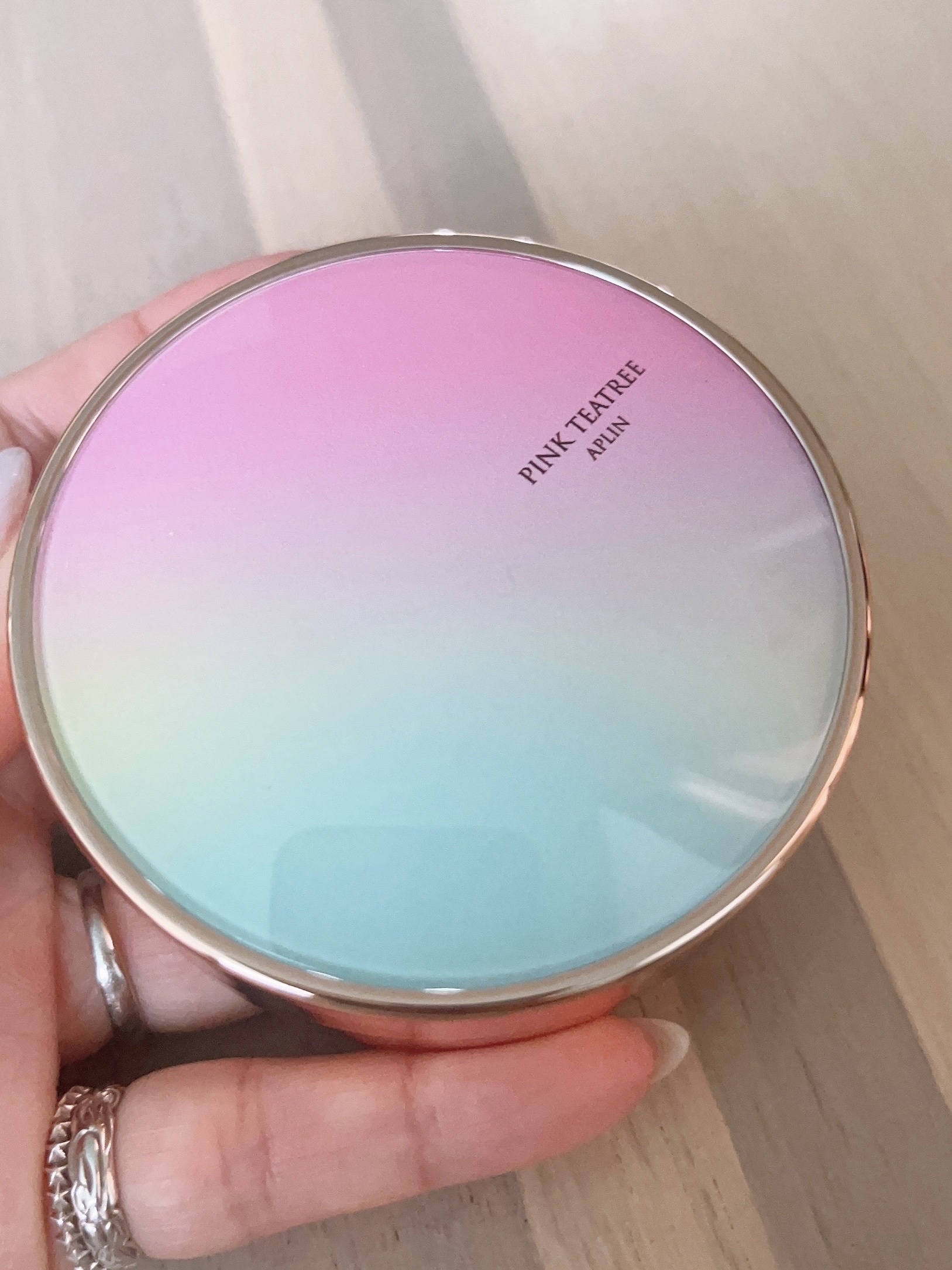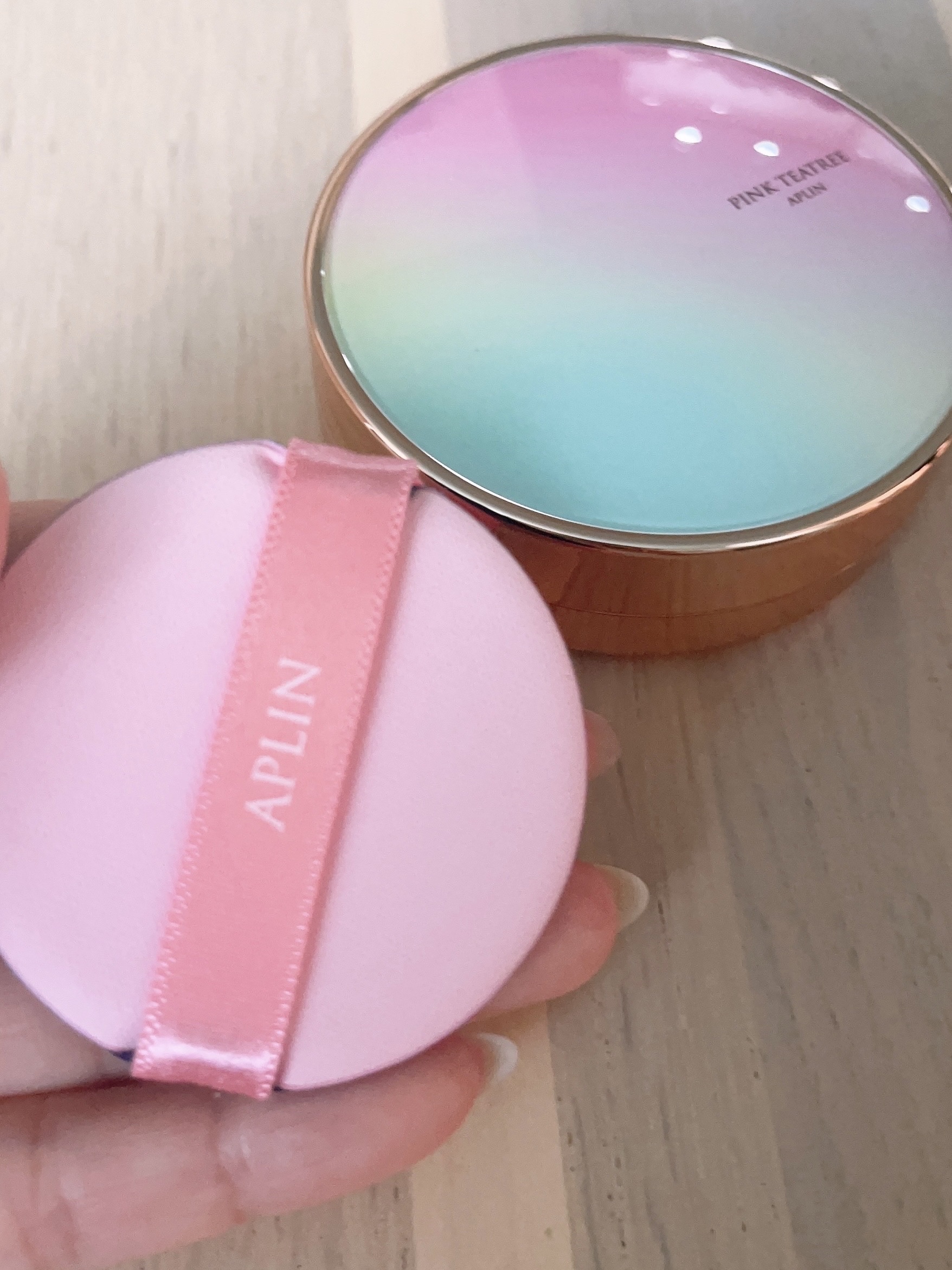APLIN ピンクティーツリーカバークッション 21号ライトベージュ 2,490円(税込) 少量でよく伸びてハイカバー! 赤みやくすみをしっかりカバ一できるのに、厚塗り感のないなめらかな仕上がり♡ ハイカバーなのにナチュラルなツヤ感とサラッとしつつ、乾燥崩れしにくい仕上がりに感動します!!