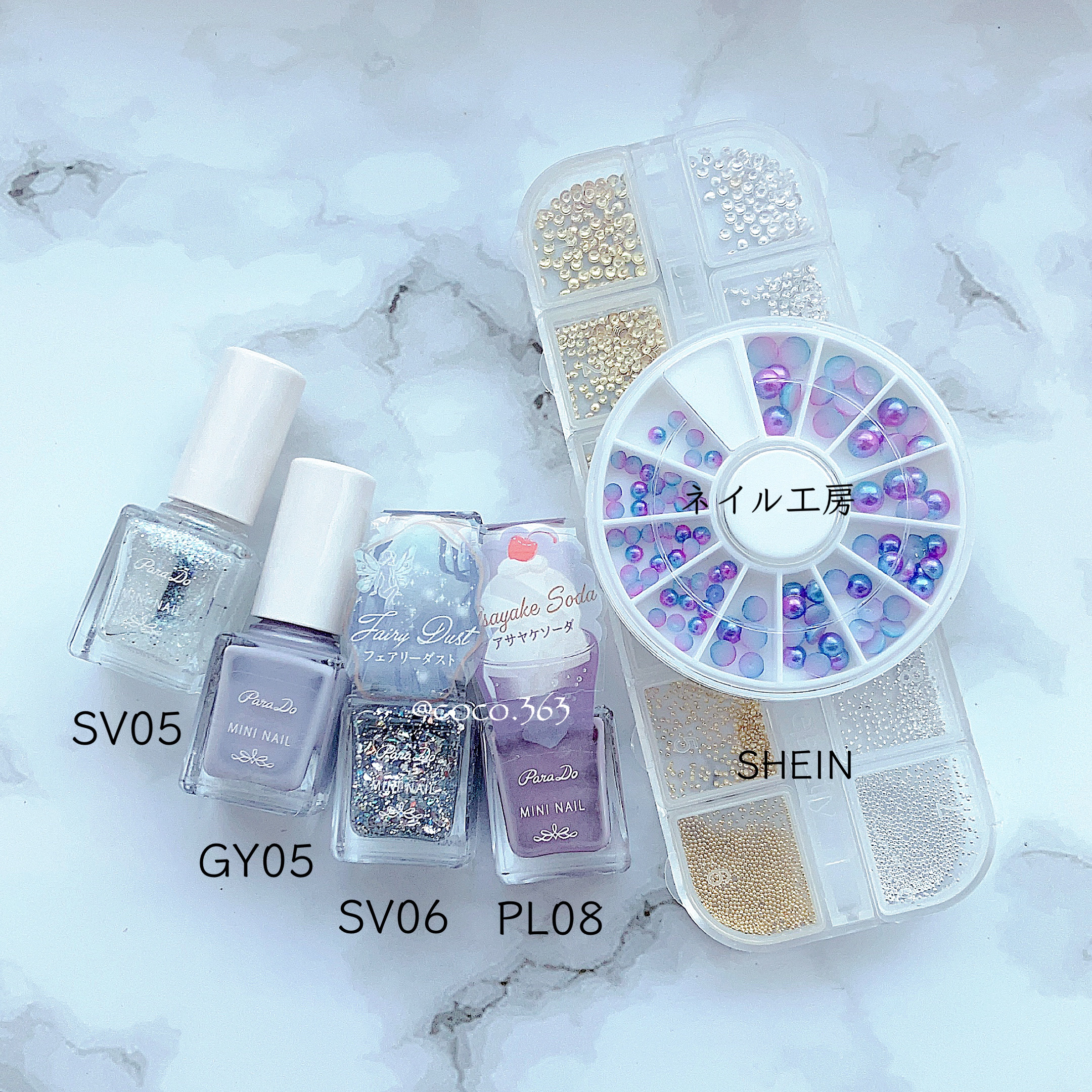 白っぽいパープルを1度塗り。乾いてからシアーなパープルを半円を描くように重ねます。 パラドゥミニネイル GY05グレームーンストーン PL08アサヤケソーダ ¥385 パープルネイル #桜色の春ネイル