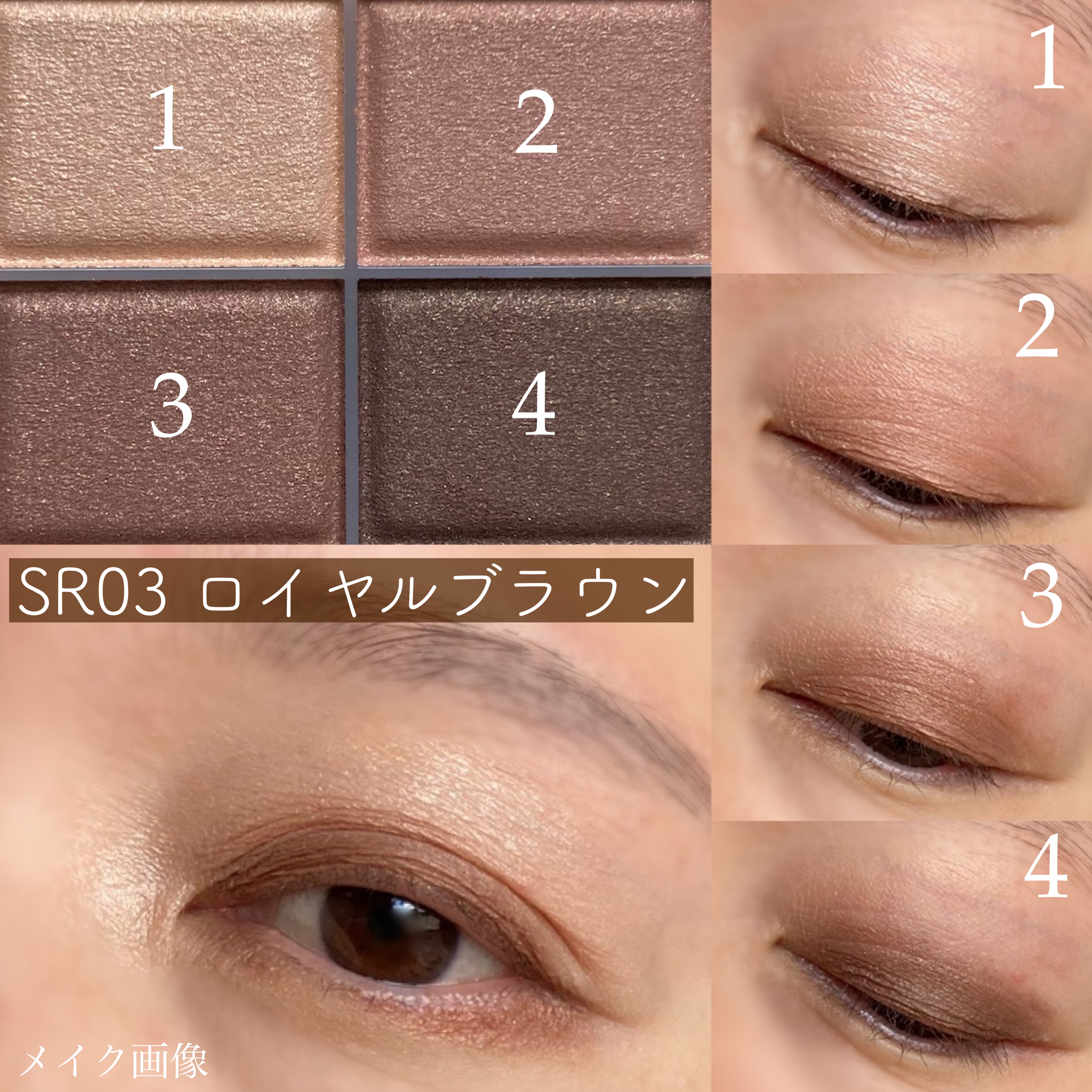 - 【ポイント】 1.失敗しらずのブラウンベースの4色パレット!簡単にグラデーションを実現。 2.しっとりリッチな質感!するする伸びて粉飛びもなく目元の乾燥も防ぎます。 3.上品な輝きの繊維パール+金パールを贅沢に配合。ギラつかない大人のツヤを演出。 <SR01'23・SR03'23・SR06'23・SR11'23(限定デザイン)> 実力派グラデアイシャドウからデジタルアートをあしらった限定デザイン登場。 しっとりリッチな密着感。肌のなじみの良い実力派グラデアイシャドウ。