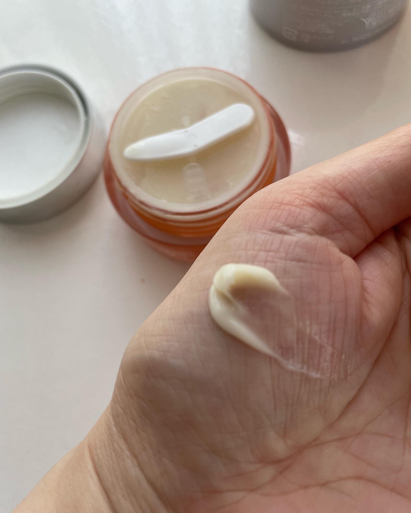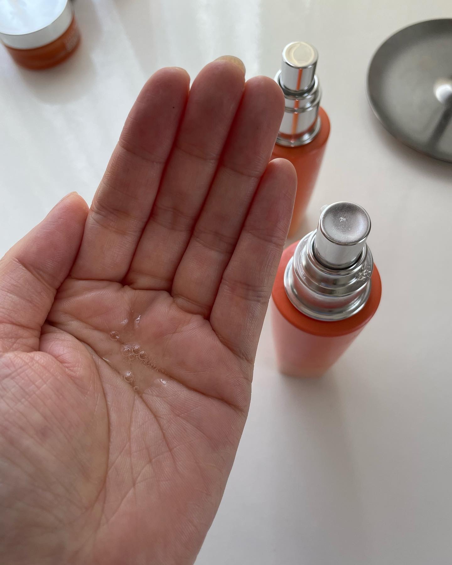 贅沢に美容成分を配合しているクリームは思ったより軽く、みずみずしく、素肌によくのびます。べとつきはしないかな。 プッシュしてエアレスボトルから新鮮なクリームが出てくるから量も調節しやすい🙆♀️ クリームはジェルのようにみずみずしいよ。少し高級化粧品によくあるような独特の香りがします。 ピンク色のエアーレスのボトル プッシュするとクリームが出てきます。