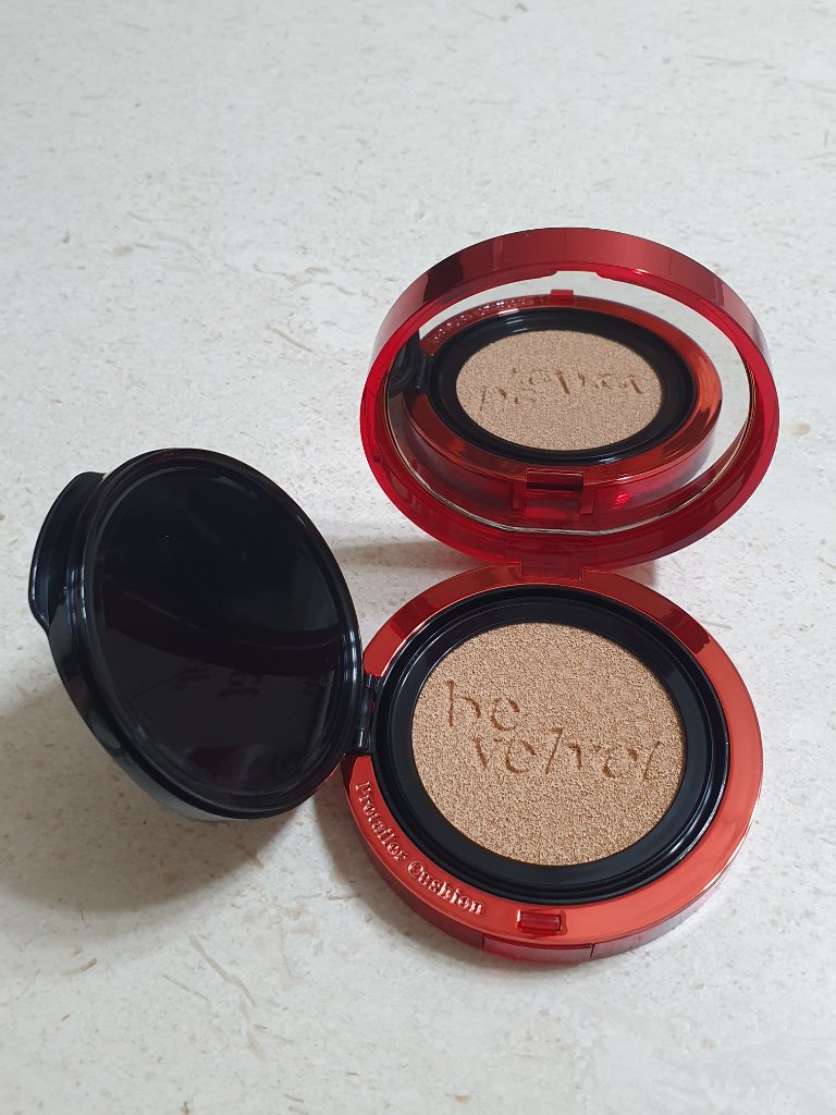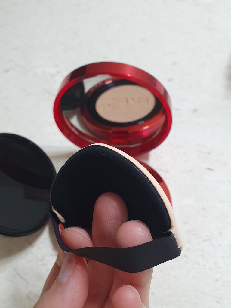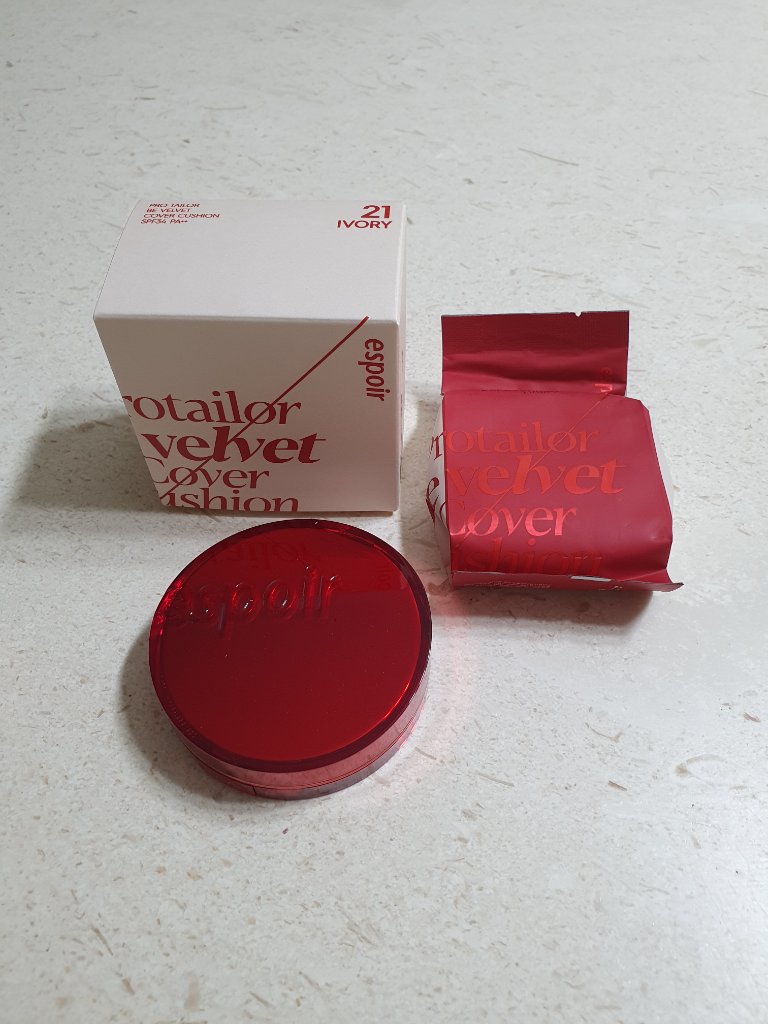 <espoirビーベルベットカバークッション>を愛用中♪鮮やかな赤色が目を引く、高級感のある素敵な容器デザイン。手に取るたびにテンションが上がります。中は大きな鏡としずく型パフが内蔵されています。さらに未開封の追加パフも入っているので、1箱に...