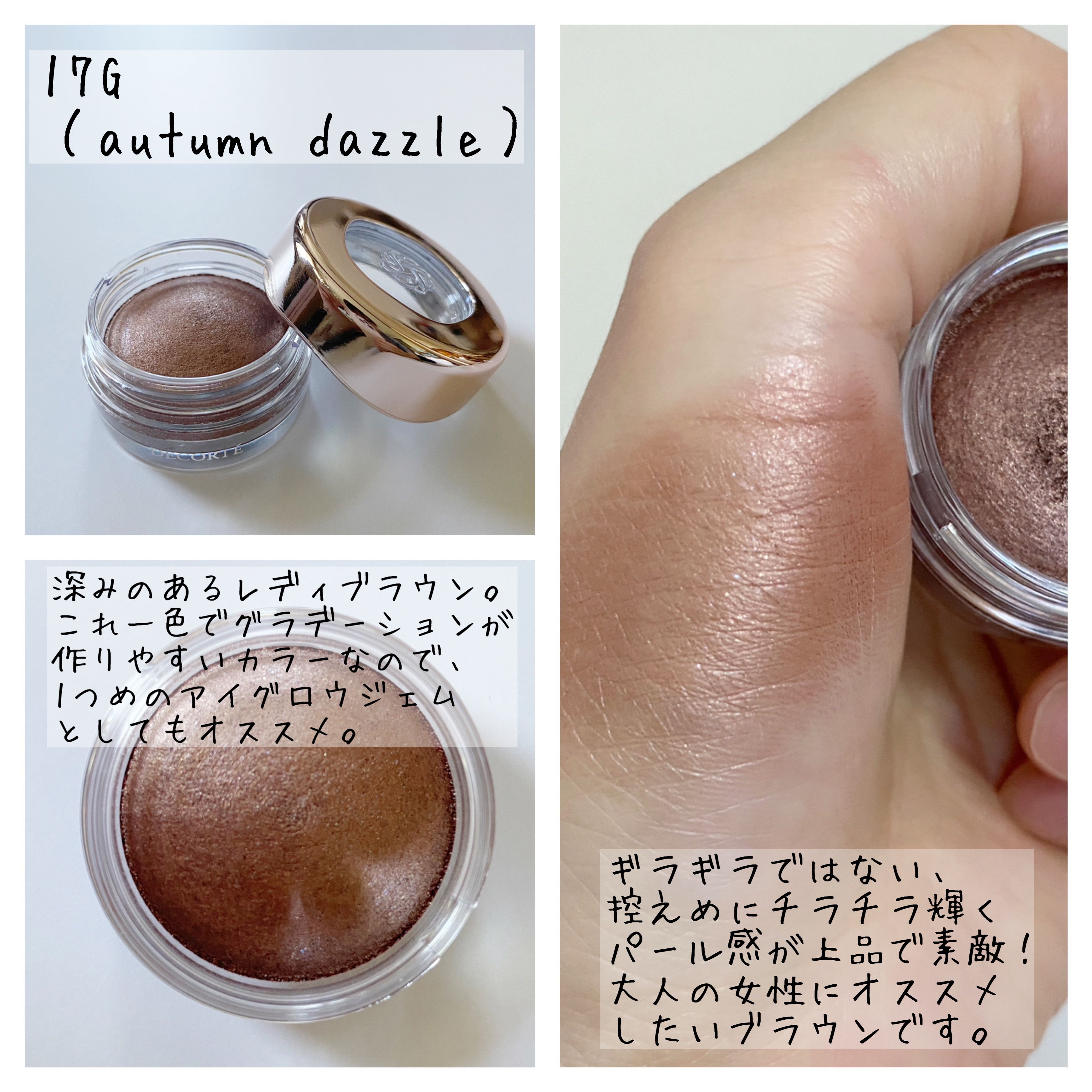 - <01G twinkle sand> シクロメチコン、合成フルオロフロゴパイト、ジフェニルジメチコン、(ジメチコン/ビニルジメチコン)クロスポリマー、イソドデカン、トリメチルシロキシケイ酸、ジメチコン、アストロカリウムムルムル種子脂、ゼニアオイエキス、ダマスクバラ花エキス、トコフェロール、マツリカ花エキス、レモン果実エキス、BG、BHT、TEA、(HDI/トリメチロールヘキシルラクトン)クロスポリマー、イソステアリン酸デキストリン、エタノール、エチルヘキサン酸セチル、キサンタンガム、シリカ、ジメチルシリル化シリカ、スクワラン、ステアリン酸イヌリン、セルロース、テトラ(ジ-t-ブチルヒドロキシヒドロケイヒ酸)ペンタエリスリチル、トリ(カプリル酸/カプリン酸)グリセリル、トリイソステアリン酸イソプロピルチタン、トリエチルヘキサノイン、ハイドロゲンジメチコン、ポリプロピレン、ミネラルオイル、合成ワックス、酸化スズ、水、水酸化Al、水添ポリ(C6-20オレフィン)、水添レシチン、麻セルロース、フェノキシエタノール、香料、オキシ塩化ビスマス、グンジョウ、マイカ、酸化チタン、酸化鉄 <02G dizzy mirage> 合成フルオロフロゴパイト、シクロメチコン、ジフェニルジメチコン、(ジメチコン/ビニルジメチコン)クロスポリマー、イソドデカン、トリメチルシロキシケイ酸、ジメチコン、アストロカリウムムルムル種子脂、ゼニアオイエキス、ダマスクバラ花エキス、トコフェロール、マツリカ花エキス、レモン果実エキス、BG、BHT、TEA、(HDI/トリメチロールヘキシルラクトン)クロスポリマー、イソステアリン酸デキストリン、エタノール、エチルヘキサン酸セチル、キサンタンガム、シリカ、ジメチルシリル化シリカ、スクワラン、ステアリン酸イヌリン、セルロース、テトラ(ジ-t-ブチルヒドロキシヒドロケイヒ酸)ペンタエリスリチル、トリ(カプリル酸/カプリン酸)グリセリル、トリイソステアリン酸イソプロピルチタン、トリエチルヘキサノイン、ハイドロゲンジメチコン、ポリプロピレン、ミネラルオイル、合成ワックス、酸化スズ、水、水酸化Al、水添ポリ(C6-20オレフィン)、水添レシチン、麻セルロース、フェノキシエタノール、香料、オキシ塩化ビスマス、グンジョウ、マイカ、酸化チタン、酸化鉄 <03G romantic crush> 合成フルオロフロゴパイト、シクロメチコン、ジフェニルジメチコン、(ジメチコン/ビニルジメチコン)クロスポリマー、イソドデカン、トリメチルシロキシケイ酸、ジメチコン、ホウケイ酸(Ca/Al)、アストロカリウムムルムル種子脂、ゼニアオイエキス、ダマスクバラ花エキス、トコフェロール、マツリカ花エキス、レモン果実エキス、BG、BHT、TEA、(HDI/トリメチロールヘキシルラクトン)クロスポリマー、イソステアリン酸デキストリン、エタノール、エチルヘキサン酸セチル、キサンタンガム、シリカ、ジメチルシリル化シリカ、スクワラン、ステアリン酸イヌリン、セルロース、テトラ(ジ-t-ブチルヒドロキシヒドロケイヒ酸)ペンタエリスリチル、トリ(カプリル酸/カプリン酸)グリセリル、トリイソステアリン酸イソプロピルチタン、トリエチルヘキサノイン、トリエトキシカプリリルシラン、ハイドロゲンジメチコン、ポリプロピレン、ミネラルオイル、合成ワックス、酸化スズ、水、水酸化Al、水添ポリ(C6-20オレフィン)、水添レシチン、麻セルロース、フェノキシエタノール、香料、オキシ塩化ビスマス、グンジョウ、マイカ、酸化チタン、酸化鉄 <04G gold glint> 合成フルオロフロゴパイト、シクロメチコン、ジフェニルジメチコン、(ジメチコン/ビニルジメチコン)クロスポリマー、イソドデカン、トリメチルシロキシケイ酸、ジメチコン、ホウケイ酸(Ca/Al)、アストロカリウムムルムル種子脂、ゼニアオイエキス、ダマスクバラ花エキス、トコフェロール、マツリカ花エキス、レモン果実エキス、BG、BHT、TEA、(HDI/トリメチロールヘキシルラクトン)クロスポリマー、イソステアリン酸デキストリン、エタノール、エチルヘキサン酸セチル、キサンタンガム、シリカ、ジメチルシリル化シリカ、スクワラン、ステアリン酸イヌリン、セルロース、テトラ(ジ-t-ブチルヒドロキシヒドロケイヒ酸)ペンタエリスリチル、トリ(カプリル酸/カプリン酸)グリセリル、トリイソステアリン酸イソプロピルチタン、トリエチルヘキサノイン、ハイドロゲンジメチコン、ポリプロピレン、ミネラルオイル、ラウリン酸亜鉛、合成ワックス、酸化スズ、水、水酸化Al、水添ポリ(C6-20オレフィン)、水添レシチン、麻セルロース、フェノキシエタノール、香料、オキシ塩化ビスマス、グンジョウ、マイカ、酸化チタン、酸化鉄 <05G peach bloom> シクロメチコン、合成フルオロフロゴパイト、ジフェニルジメチコン、(ジメチコン/ビニルジメチコン)クロスポリマー、イソドデカン、トリメチルシロキシケイ酸、ジメチコン、アストロカリウムムルムル種子脂、ゼニアオイエキス、ダマスクバラ花エキス、トコフェロール、マ