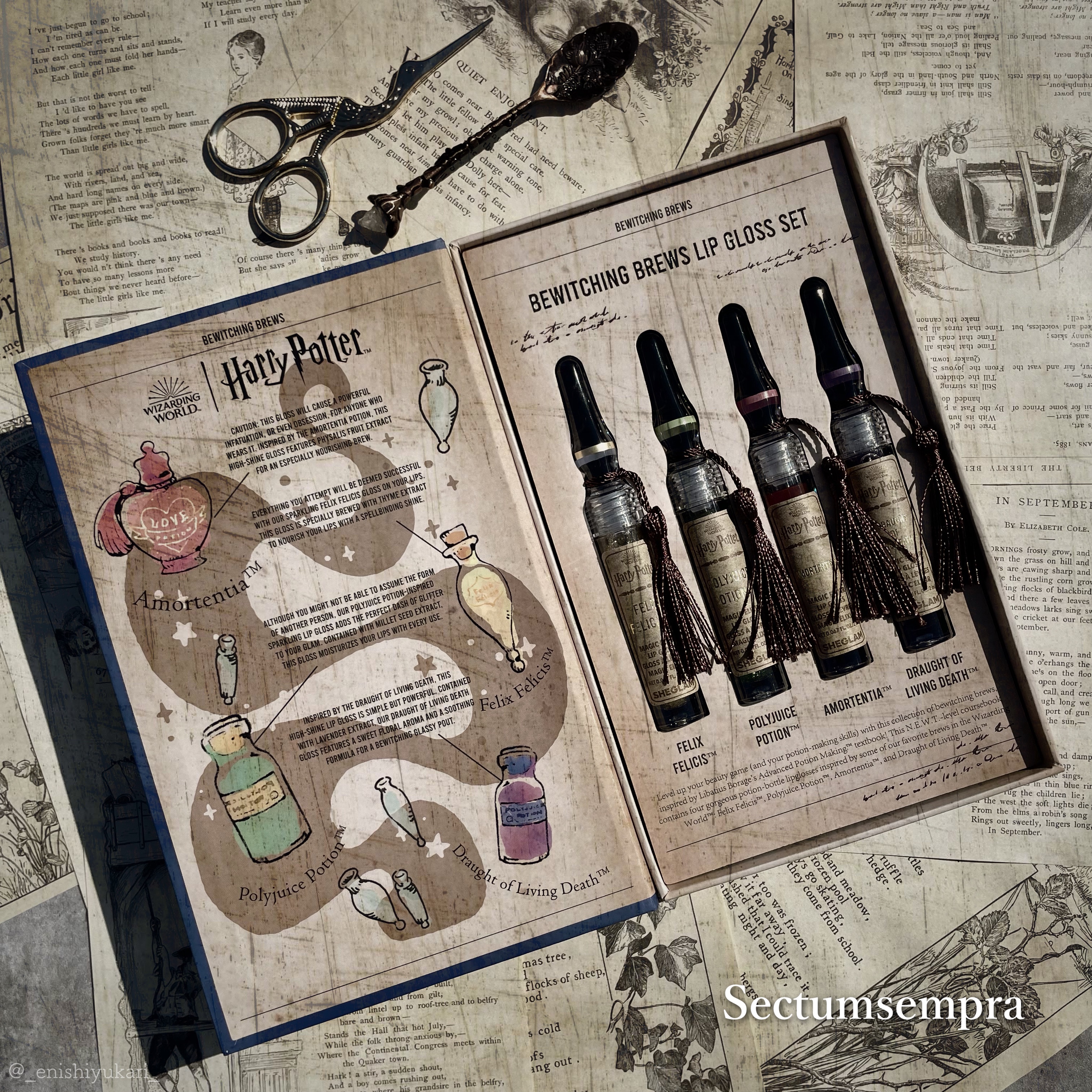 グロスはそれぞれフェリックスフェシリス、ポリジュース薬、アモルテンシア(惚れ薬)、生ける屍の妙薬と名前がついていて、それっぽい色のグロスです。 フェリックスフェシリスはすべての物事が成功する効果を持つ薬。そのイメージからか、クリアベースにイエローのゴールドラメが入っていて、きらきらしてます。 ポリジュース薬はハーマイオニーが間違えて猫に変身してしまったのは、ハリポタ見ている方ならおわかりかと思います。こちらはそのイメージでグリーンのラメが入っていて、まさにポリジュース薬みたいなカラーです。 アモルテンシアは惚れ薬なので、ピンク色なのはぴったりです。ただ惚れ薬とは言っても、対象の人に狂気とも見える執着心と愛着を示すようになるので、ほぼストーカー製造薬に近いんじゃないかと思いますよね😅 生ける屍の妙薬はとっても強力な眠り薬で、成分が強いと永遠の眠りに落ちてしまうこともあるとか……💦そのイメージなのか毒々しいパープルに見えますが、シアーなカラーなので、重ねづけしやすいと思います。