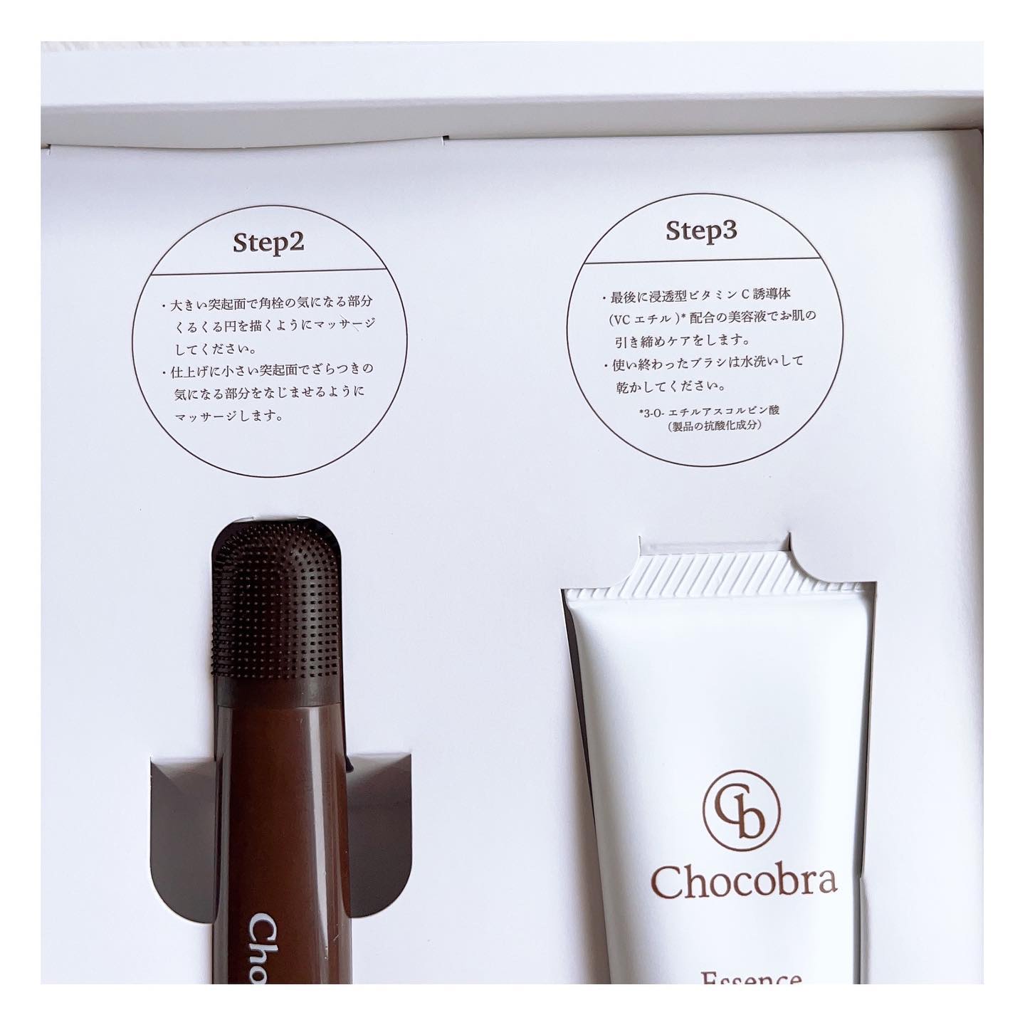 大人なので無茶苦茶剥がす!とかではなく丁寧に毛穴に向かい合いたい、ということでチョコブラスペシャル毛穴ケアセット このブラシは最初に大きい突起面でくるくるマッサージ 後半はスティックの反対側の小さい突起面で馴染ませケア 鼻だけじゃなくて、顎の部分の皮脂詰まりきになる 若い頃はここをテレカ(時代…)とかでこすり取るという雑なケア?をしてたけど、もう今そんなことしたらシミ待ったなしだからこういうアプローチ助かります