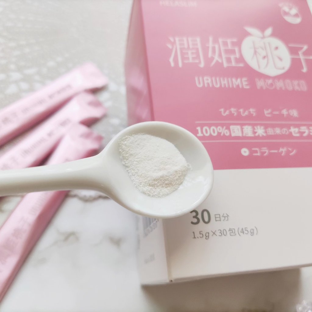 100%国産米由来セラミド配合のパウダーサプリで美容サポート!!.✿潤姫桃子.100%国産米由来のグルコシルセラミド、コラーゲン、4種のビタミンが配合されているよ✨.ピッと切ってササッと飲めるスティックタイプ♪やさしい甘みのピーチ味で美味しい...
