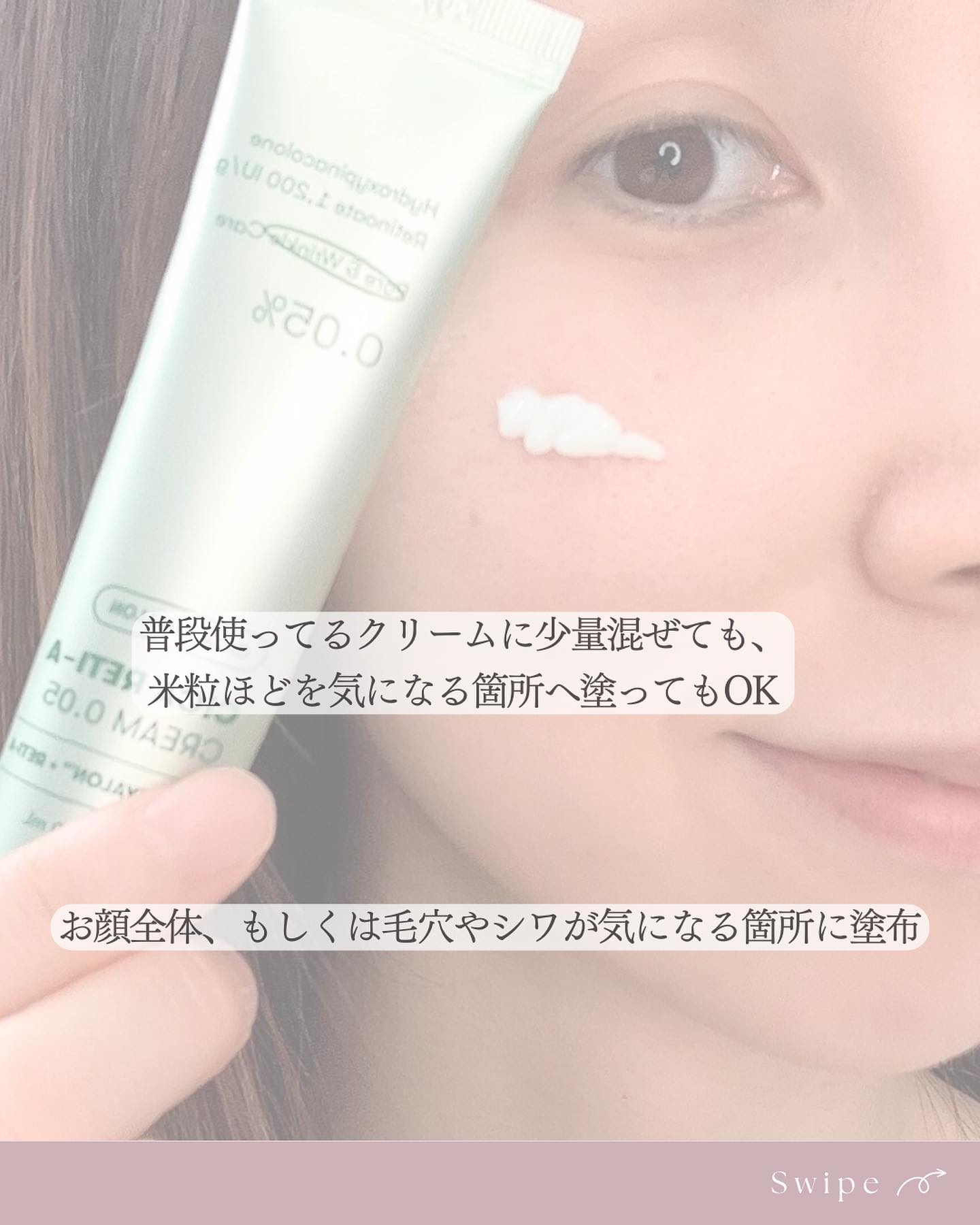 - 気になる部位にスポットケア - レチノールという整肌成分が初めての方でも使用可能◎ *パッケージのポイント! 先端部分が細くなっているため、使用量が調整しやすく簡単に使用できます。 クリームだからこそ初心者向け - 肌への負担を抑えながら毛穴へアプローチ ◎ 優しくとけ込み角質層隅々まで届く - 肌に馴染みやすいなめらかな使用感 ◎しっとり潤って密着し肌のキメを整えます。 ◎肌あれ予防ケア STEP1. 普段ご使用中のクリームに少量を混ぜて塗ってみてください。 STEP2. 肌が成分に慣れてきたら米粒ほどを手に取り気になる部分へクリームの段階で塗ってください。