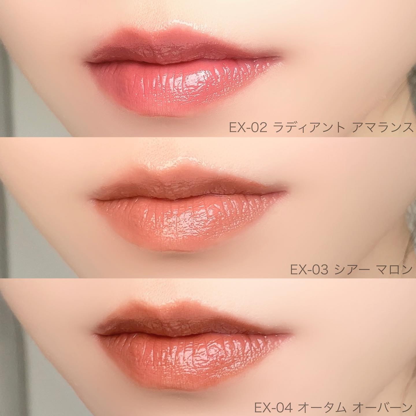 - <01 シアー セピア> テトライソステアリン酸ジペンタエリスリチル、ジカプリン酸ネオペンチルグリコール、トリメチルシロキシケイ酸、リンゴ酸ジイソステアリル、ヒドロキシステアリン酸エチルヘキシル、イソドデカン、オクチルドデカノール、マイクロクリスタリンワックス、セレシン、ラウロイルグルタミン酸ジ(オクチルドデシル/フィトステリル/ベヘニル)、ジステアルジモニウムヘクトライト、水添ポリイソブテン、炭酸プロピレン、トコフェロール、カニナバラ果実油、ヒアルロン酸Na、フェノキシエタノール、(+/-)(チタン/酸化チタン)焼結物、マイカ、ラウロイルアスパラギン酸Na、ラウロイルリシン、塩化亜鉛、酸化チタン、酸化鉄、水酸化Al、硫酸Ba、トリイソステアリン酸イソプロピルチタン、トリエトキシカプリリルシラン、黄4、黄5、青1、赤201、赤202 <02 ウォーム バタースコッチ> テトライソステアリン酸ジペンタエリスリチル、ジカプリン酸ネオペンチルグリコール、トリメチルシロキシケイ酸、リンゴ酸ジイソステアリル、ヒドロキシステアリン酸エチルヘキシル、イソドデカン、オクチルドデカノール、マイクロクリスタリンワックス、セレシン、ラウロイルグルタミン酸ジ(オクチルドデシル/フィトステリル/ベヘニル)、ジステアルジモニウムヘクトライト、水添ポリイソブテン、炭酸プロピレン、トコフェロール、カニナバラ果実油、ヒアルロン酸Na、フェノキシエタノール、(+/-)(チタン/酸化チタン)焼結物、マイカ、ラウロイルアスパラギン酸Na、ラウロイルリシン、塩化亜鉛、酸化チタン、酸化鉄、水酸化Al、硫酸Ba、トリイソステアリン酸イソプロピルチタン、トリエトキシカプリリルシラン、黄4、黄5、青1、赤201、赤202 <03 ボルドー ウェーブ> テトライソステアリン酸ジペンタエリスリチル、ジカプリン酸ネオペンチルグリコール、トリメチルシロキシケイ酸、リンゴ酸ジイソステアリル、ヒドロキシステアリン酸エチルヘキシル、イソドデカン、オクチルドデカノール、マイクロクリスタリンワックス、セレシン、ラウロイルグルタミン酸ジ(オクチルドデシル/フィトステリル/ベヘニル)、ジステアルジモニウムヘクトライト、水添ポリイソブテン、炭酸プロピレン、トコフェロール、カニナバラ果実油、ヒアルロン酸Na、フェノキシエタノール、(+/-)(チタン/酸化チタン)焼結物、マイカ、ラウロイルアスパラギン酸Na、ラウロイルリシン、塩化亜鉛、酸化チタン、酸化鉄、水酸化Al、硫酸Ba、トリイソステアリン酸イソプロピルチタン、トリエトキシカプリリルシラン、黄4、黄5、青1、赤201、赤202 <04 スパイスド サングリア> テトライソステアリン酸ジペンタエリスリチル、ジカプリン酸ネオペンチルグリコール、トリメチルシロキシケイ酸、リンゴ酸ジイソステアリル、ヒドロキシステアリン酸エチルヘキシル、イソドデカン、オクチルドデカノール、マイクロクリスタリンワックス、セレシン、ラウロイルグルタミン酸ジ(オクチルドデシル/フィトステリル/ベヘニル)、ジステアルジモニウムヘクトライト、水添ポリイソブテン、炭酸プロピレン、トコフェロール、カニナバラ果実油、ヒアルロン酸Na、フェノキシエタノール、(+/-)(チタン/酸化チタン)焼結物、マイカ、ラウロイルアスパラギン酸Na、ラウロイルリシン、塩化亜鉛、酸化チタン、酸化鉄、水酸化Al、硫酸Ba、トリイソステアリン酸イソプロピルチタン、トリエトキシカプリリルシラン、黄4、黄5、青1、赤201、赤202 <05 サキュレント ストロベリー> テトライソステアリン酸ジペンタエリスリチル、ジカプリン酸ネオペンチルグリコール、トリメチルシロキシケイ酸、リンゴ酸ジイソステアリル、ヒドロキシステアリン酸エチルヘキシル、イソドデカン、オクチルドデカノール、マイクロクリスタリンワックス、セレシン、ラウロイルグルタミン酸ジ(オクチルドデシル/フィトステリル/ベヘニル)、ジステアルジモニウムヘクトライト、水添ポリイソブテン、炭酸プロピレン、トコフェロール、カニナバラ果実油、ヒアルロン酸Na、フェノキシエタノール、(+/-)(チタン/酸化チタン)焼結物、マイカ、ラウロイルアスパラギン酸Na、ラウロイルリシン、塩化亜鉛、酸化チタン、酸化鉄、水酸化Al、硫酸Ba、トリイソステアリン酸イソプロピルチタン、トリエトキシカプリリルシラン、黄4、黄5、青1、赤201、赤202 <06 アラモアナ モーブ> テトライソステアリン酸ジペンタエリスリチル、ジカプリン酸ネオペンチルグリコール、トリメチルシロキシケイ酸、リンゴ酸ジイソステアリル、ヒドロキシステアリン酸エチルヘキシル、イソドデカン、オクチルドデカノール、マイクロクリスタリンワックス、セレシン、ラウロイルグルタミン酸ジ(オクチルドデシル/フィトステリル/ベヘニル)、ジステアルジモニウムヘクトライト、水添ポリイソブテン、炭酸プロピレン、トコフェロール、カニナバラ果実油、ヒアルロン酸Na、フェノキシエタノール、(+/-)(チタン/酸化チ