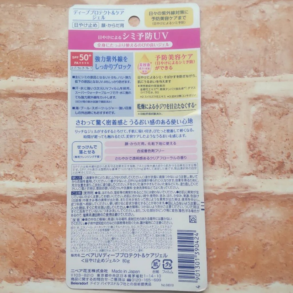 *ニベアUVディーププロテクト&ケアジェルリニューアルされた日焼け止めジェルUV-BだけでなくUV-Aにも着目した改良とのことSPF50+PA++++汗や水に強いスーパーウォータープルーフなので夏のレジャーの際に使ってみたいです顔・からだ共に...