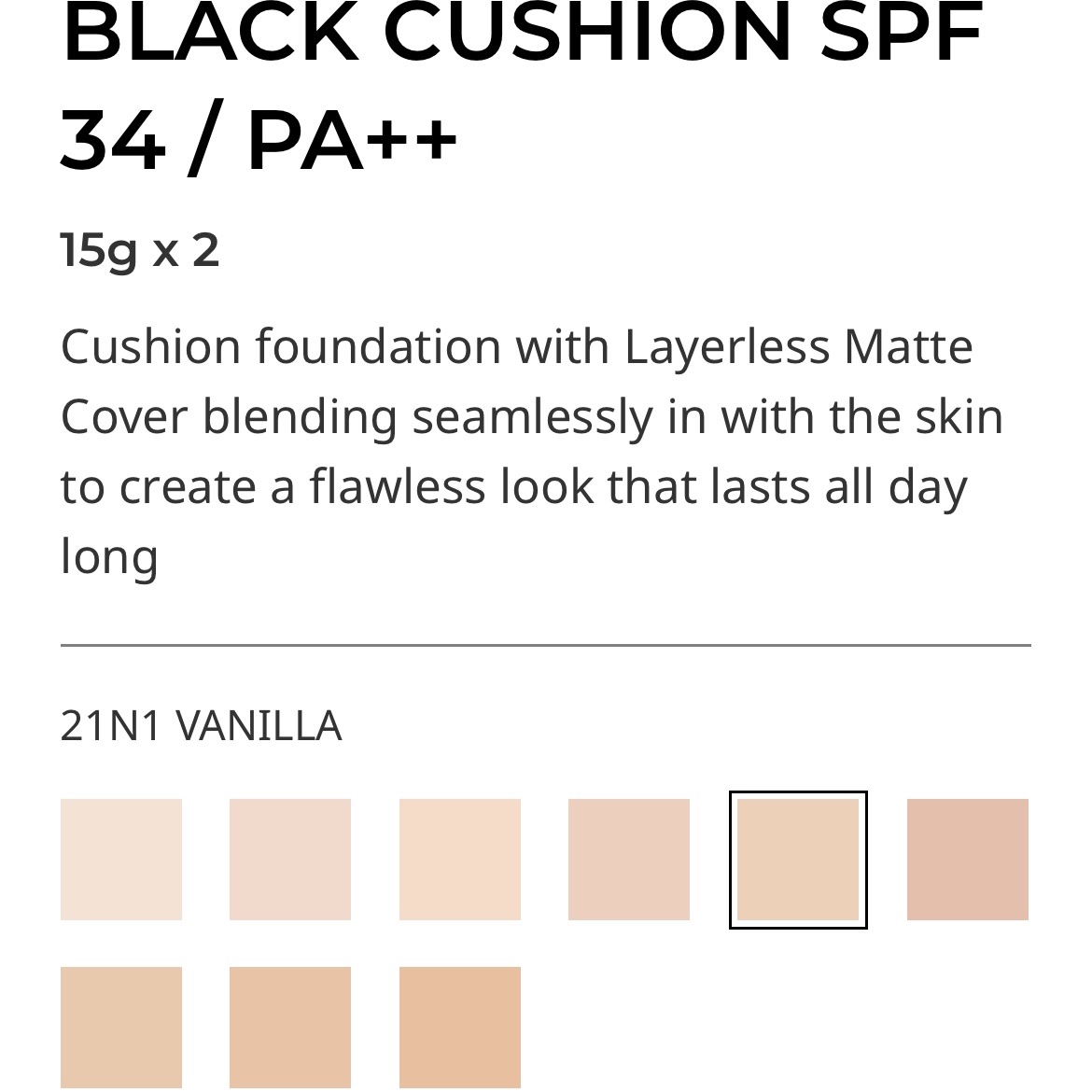 - きめ細かく肌にフィットして密着するレイヤーレスカバー 素肌のように軽いベルベット肌が24時間*1つづくクッションファンデ 1.Layerless Matte Cover 薄く均一なカバー力を叶える「マグネフィットパウダー」と 肌の凸凹にきめ細かくなめらかに密着する「3レイヤーフィルム」を採用 ハイカバーなのに軽やかなフィット感 2.24 Hour High-End Stay 4つの特性で叶える完成度の高いフローレス肌が24時間*1持続 マスクプルーフ効果*1 3.Asian Skin Fit Shade アジア人女性の肌に合わせて設計された全7色のシェードバリエーション クッションファンデーションに最適な、少し明るめのブルーベース~ニュートラルトーン さまざまな肌色にマッチするシェードで、もっとも自分らしい肌トーンを演出