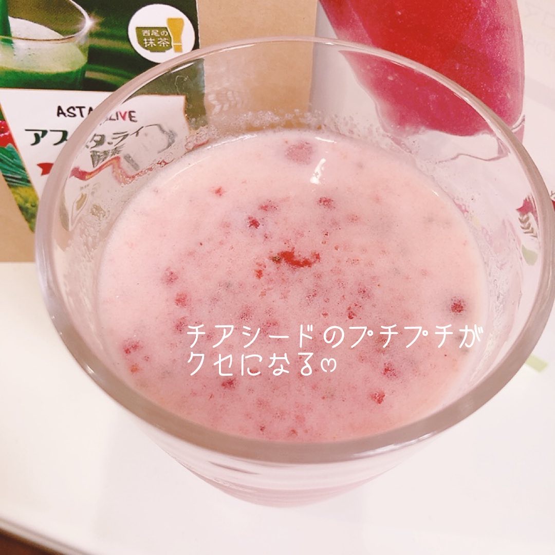 チアシード、グルコマンナン配合で、とろとろっとした仕上がりになります。 フルーツミックスベリー味は、甘酸っぱいし、プチプチしたチアシードがアクセントになりますね。 シェイカーで溶かすと、パウダーだったと思えないピンク色で、普通のジュースみたいな雰囲気です。