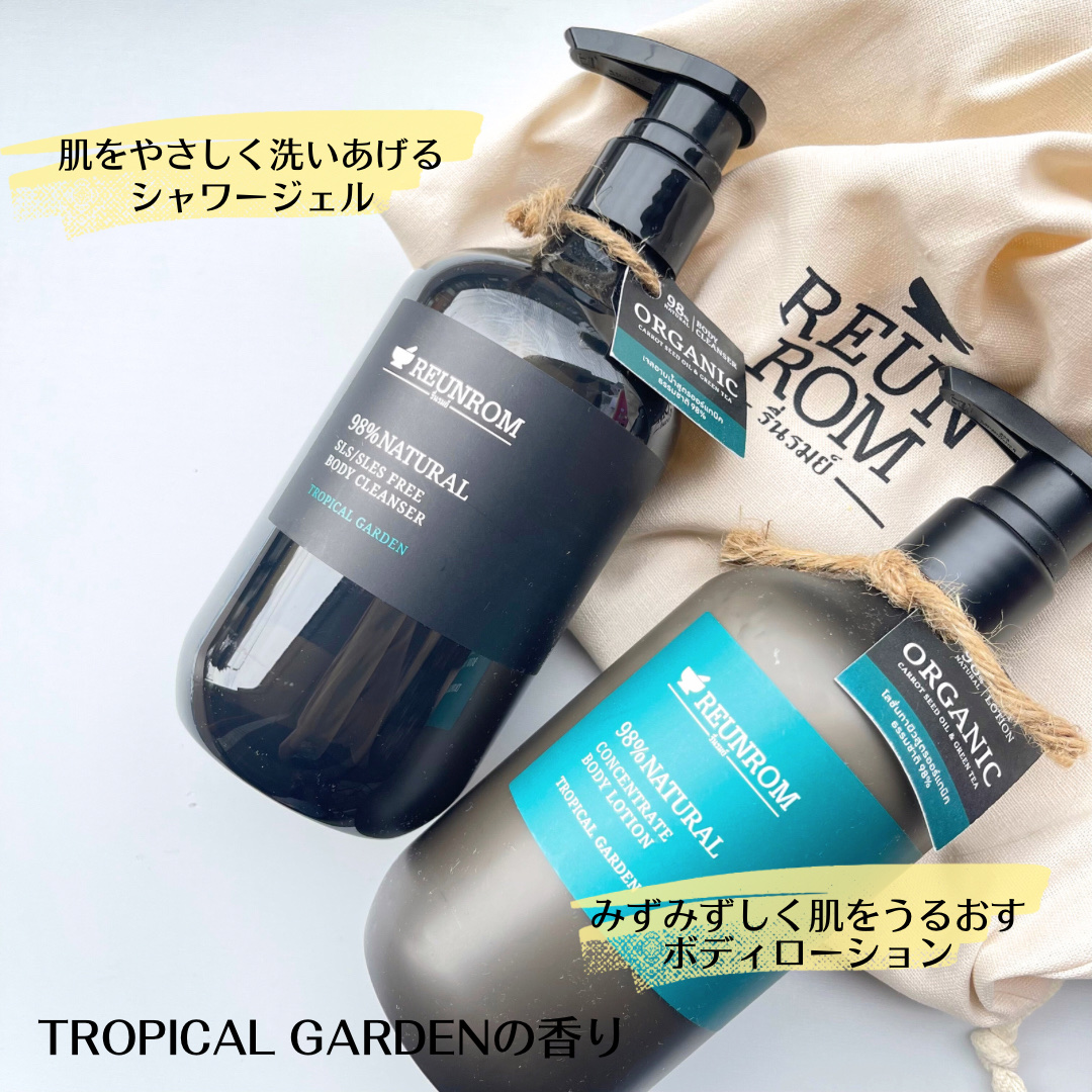 ジェル状に近い透明のクレンザー泡だてていくと柔らかな濃密な泡が立ちますトロピカルガーデンの香りはハーブのような爽やかな香りしっとりとした洗い上がりで心地よいです こっくりとしたクリーム伸びがよく手や足を中心に全身をマッサージしながらつけていますこちらもふんわりと立ち上るトロピカルガーデンの香りが癒しの時間を演出乾燥しがちな40代の肌に潤いを与えてくれる優れものです 7種の植物オイルと9種の植物由来エキスを贅沢に配合しているボディケア2種どちらもスパのような心地よいボディケアを実現してくれるおすすめの逸品です