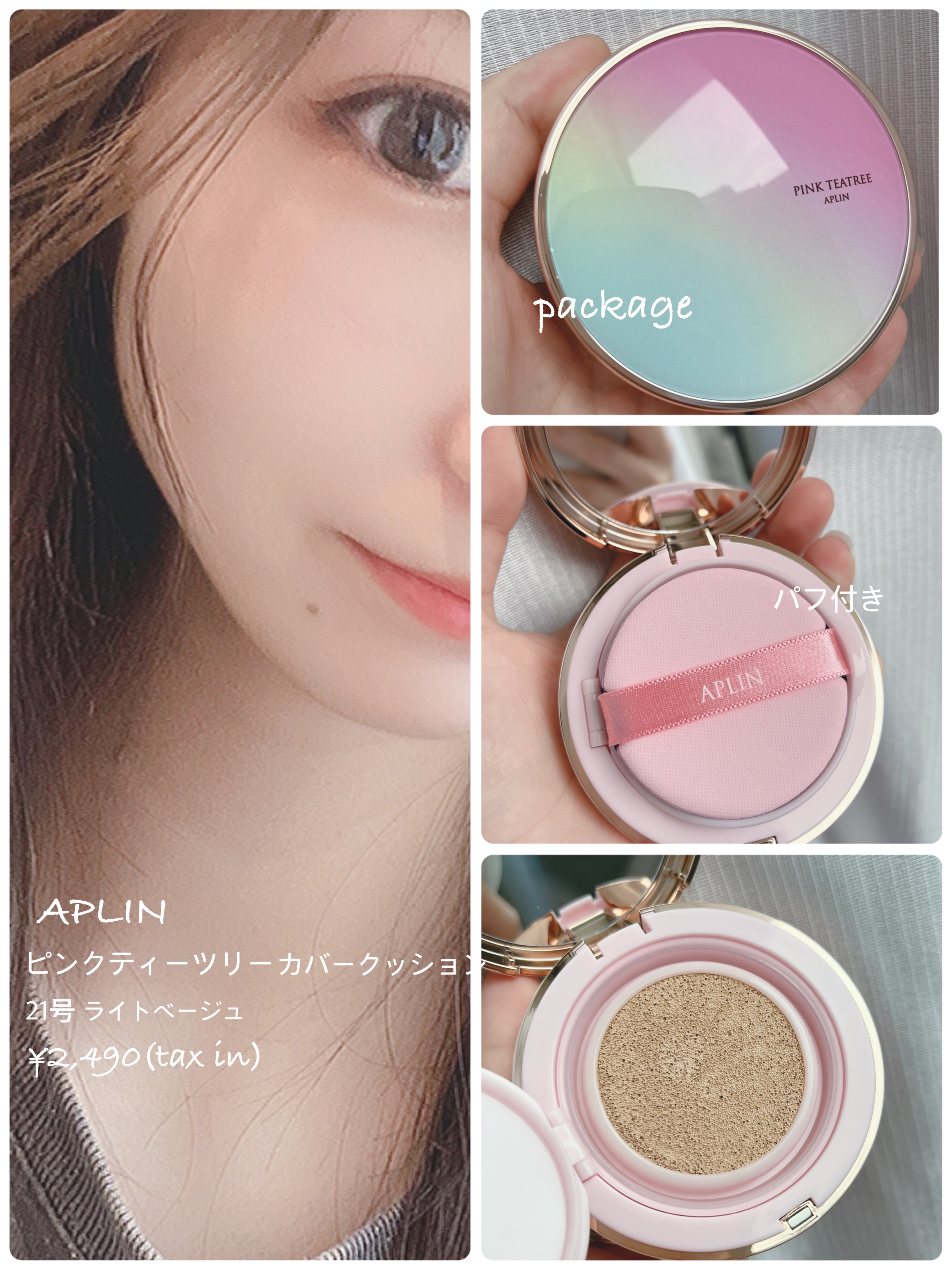 APLIN ピンクティーツリーカバークッション 21号ライトベージュ 2,490円(税込) 少量でよく伸びてハイカバー! 赤みやくすみをしっかりカバ一できるのに、厚塗り感のないなめらかな仕上がり♡ ハイカバーなのにナチュラルなツヤ感とサラッとしつつ、乾燥崩れしにくい仕上がりに感動します!!