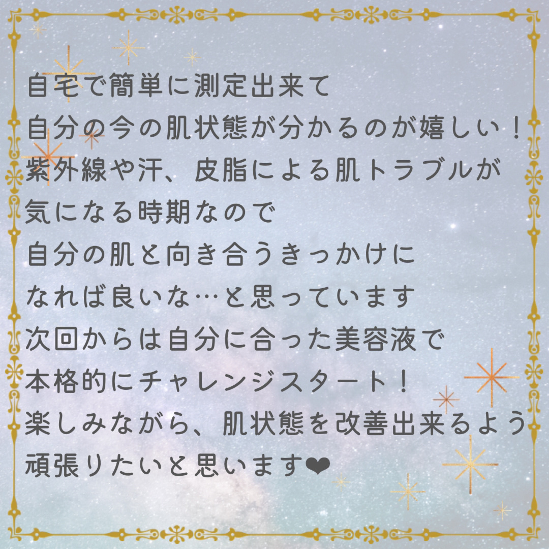 Cocoskinさんの協力の元現状の肌を知り、なりたい肌へと導く。 まずはcocoskin様より肌解析キットを頂きまして、手順に添いお肌チェックをしてキットをポストへ投函。 REISE(ライゼ)のエッセンスセラム乳液。お肌にうるおいを与え、キメの整ったお肌。水分を保持する力を補う事が出来る乳液タイプ。 私のお肌はとにかく潤い不足。肌への水分補給と保持が出来るものかつ、ベタつくのが嫌いなのでベタつきにくいものを選んで頂きました♡ また敏感肌なので、お肌に刺激の少ないもの。Zoomで色んなお話をする事でとてもよいものを選べたと思います。 お肌の状態としては、潤い不足ではあるもののその他は比較的いい状態みたい。 今回選んだ美容液で1ヶ月肌育チャレンジを行います。 また後日、肌解析を行い変化をチェック。 どんな変化があるのか楽しみ🩷 また途中経過をアップしていきます!