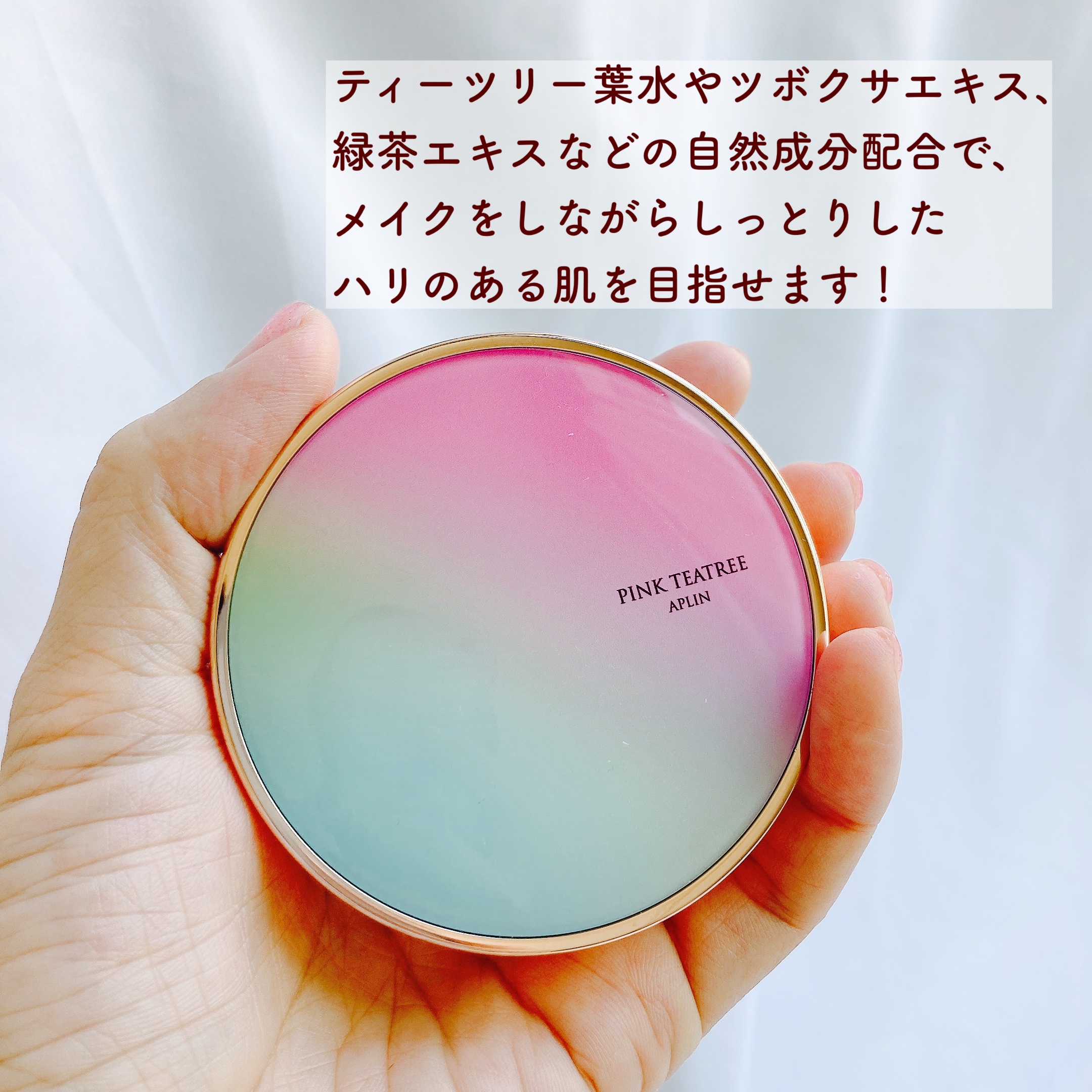 APLIN ピンクティーツリーカバークッション 21号ライトベージュ 2,490円(税込) 少量でよく伸びてハイカバー! 赤みやくすみをしっかりカバ一できるのに、厚塗り感のないなめらかな仕上がり♡ ハイカバーなのにナチュラルなツヤ感とサラッとしつつ、乾燥崩れしにくい仕上がりに感動します!!
