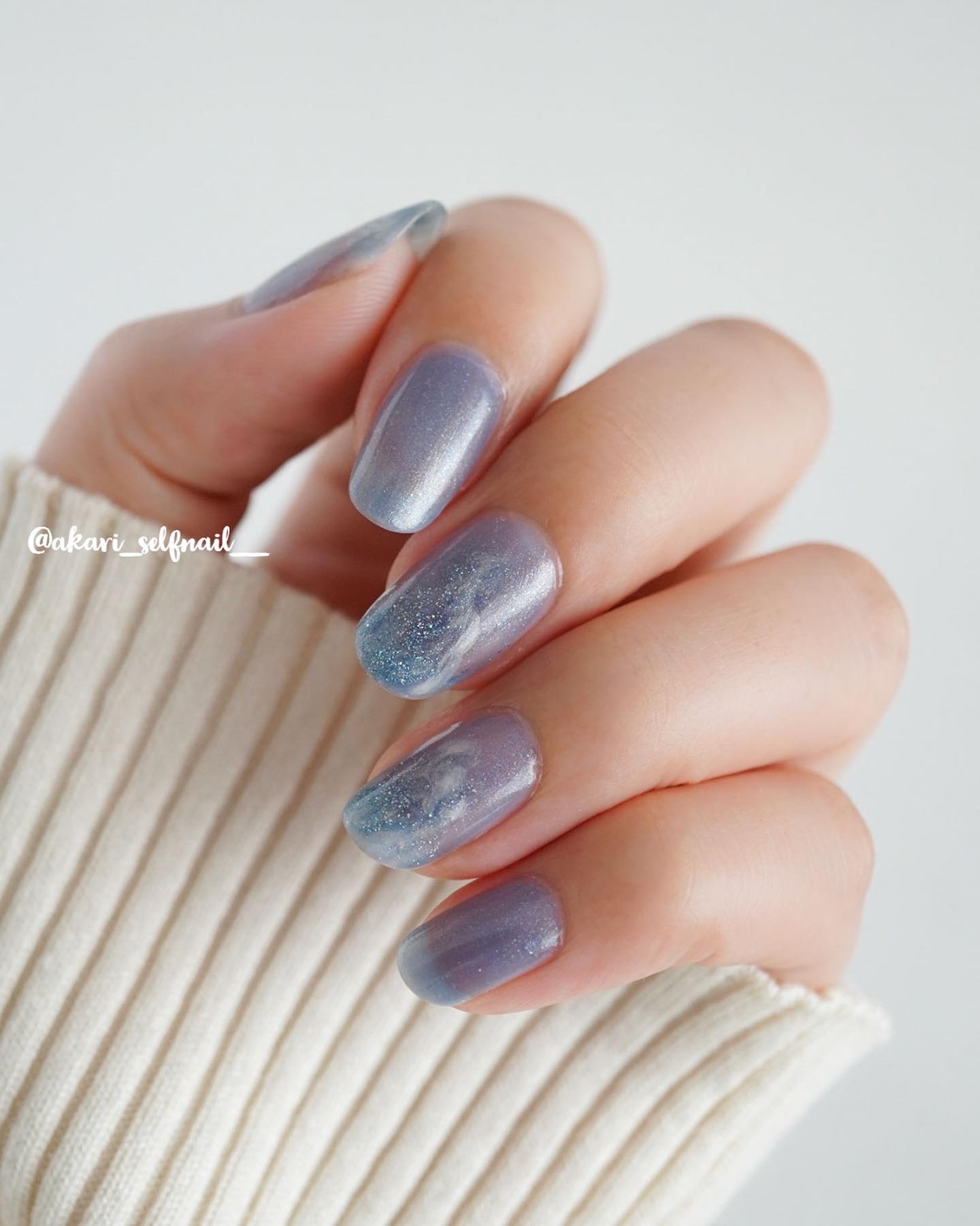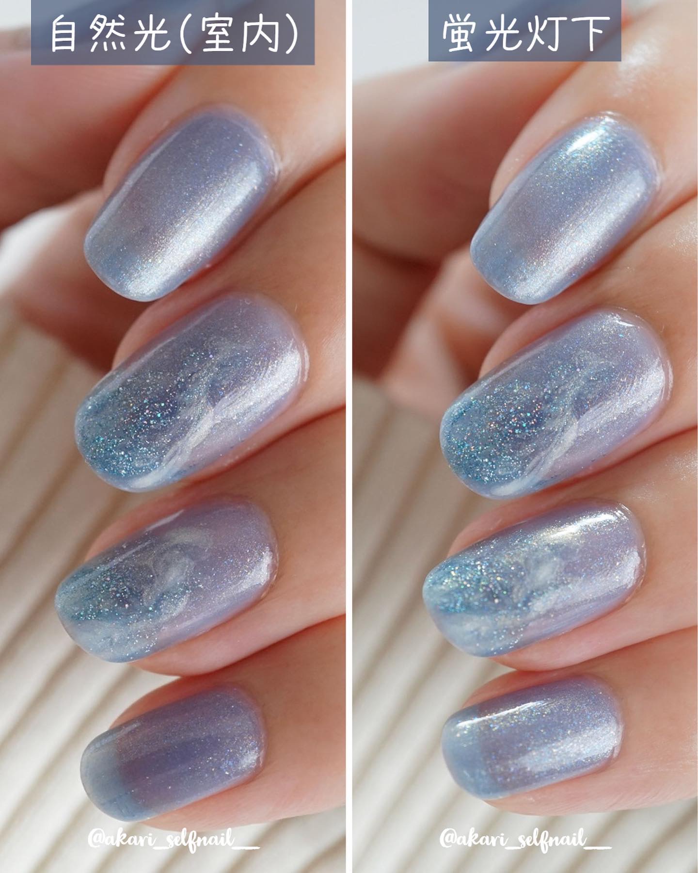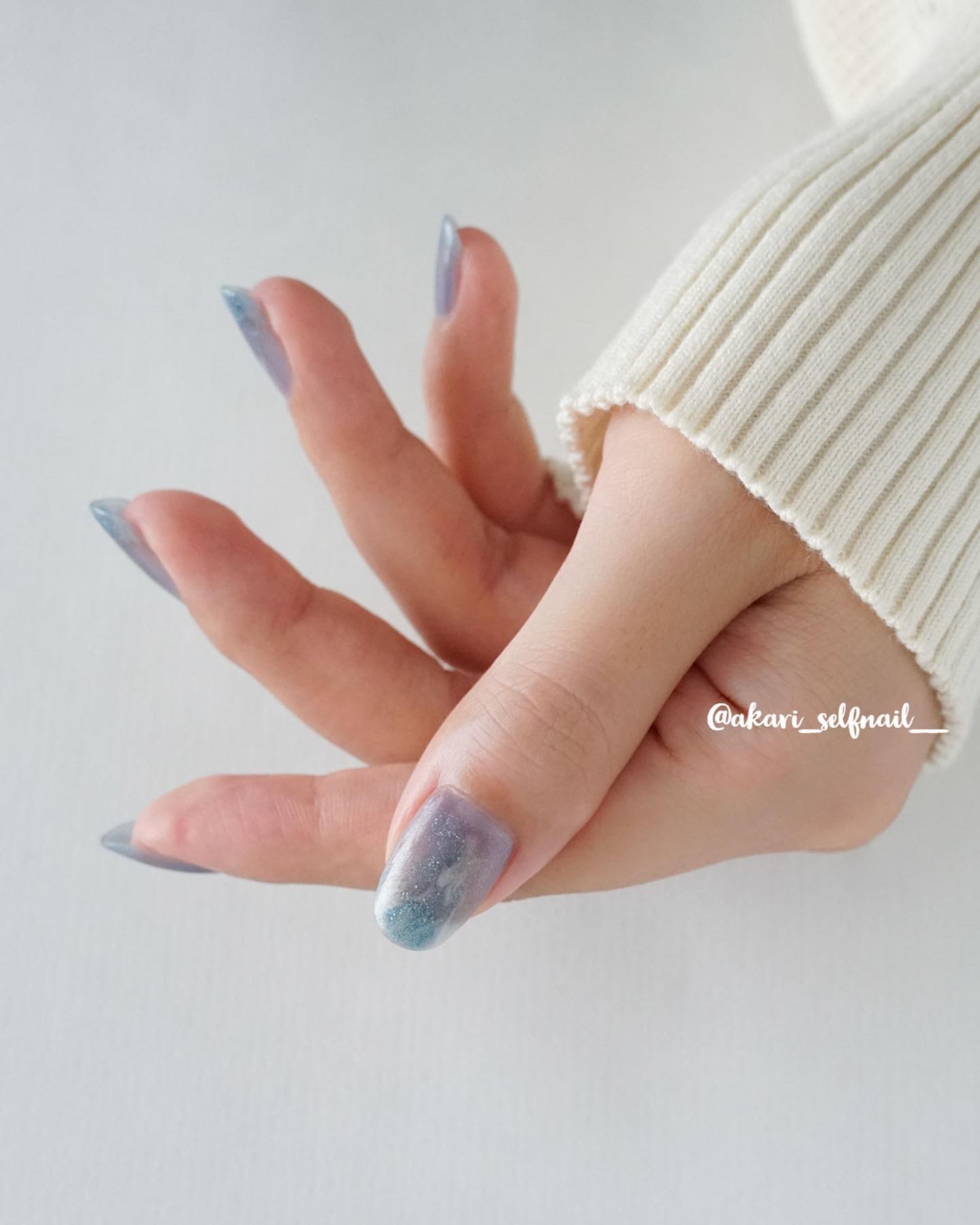 ベースにフレークをふぁさっと乗せて乾かしたら 2色をランダムに塗り重ねるだけ。 シアーだからぼかし不要で ニュアンスっぽくなるのありがたい…🥹 室内でも外でもずっと眺めていられるような 美しいカラーでした✨ 色味もラメ感も好きすぎる💙