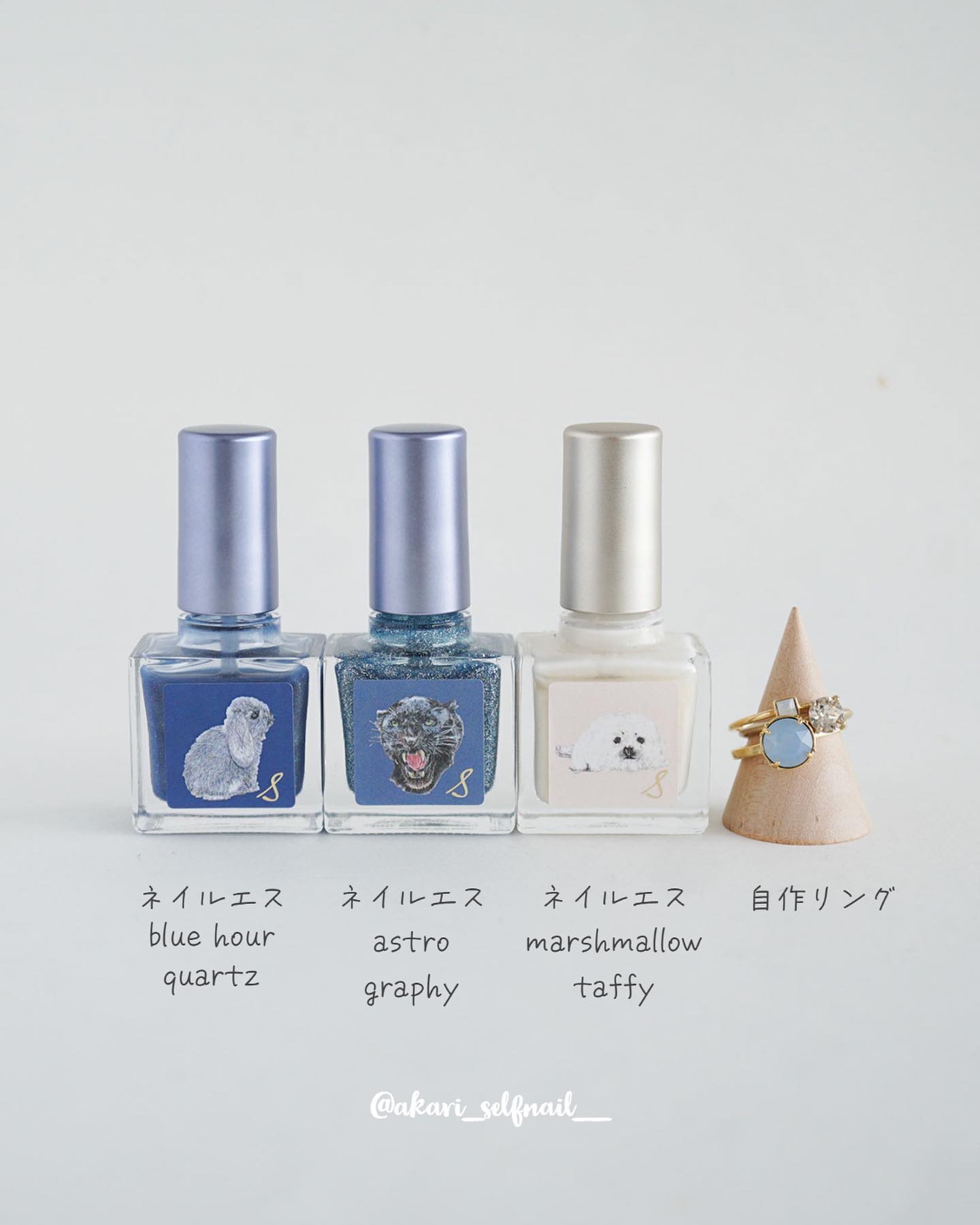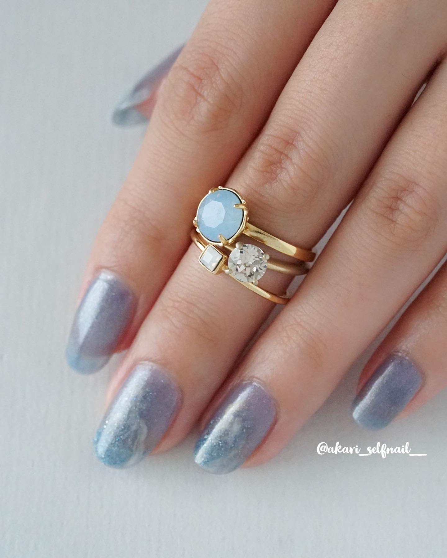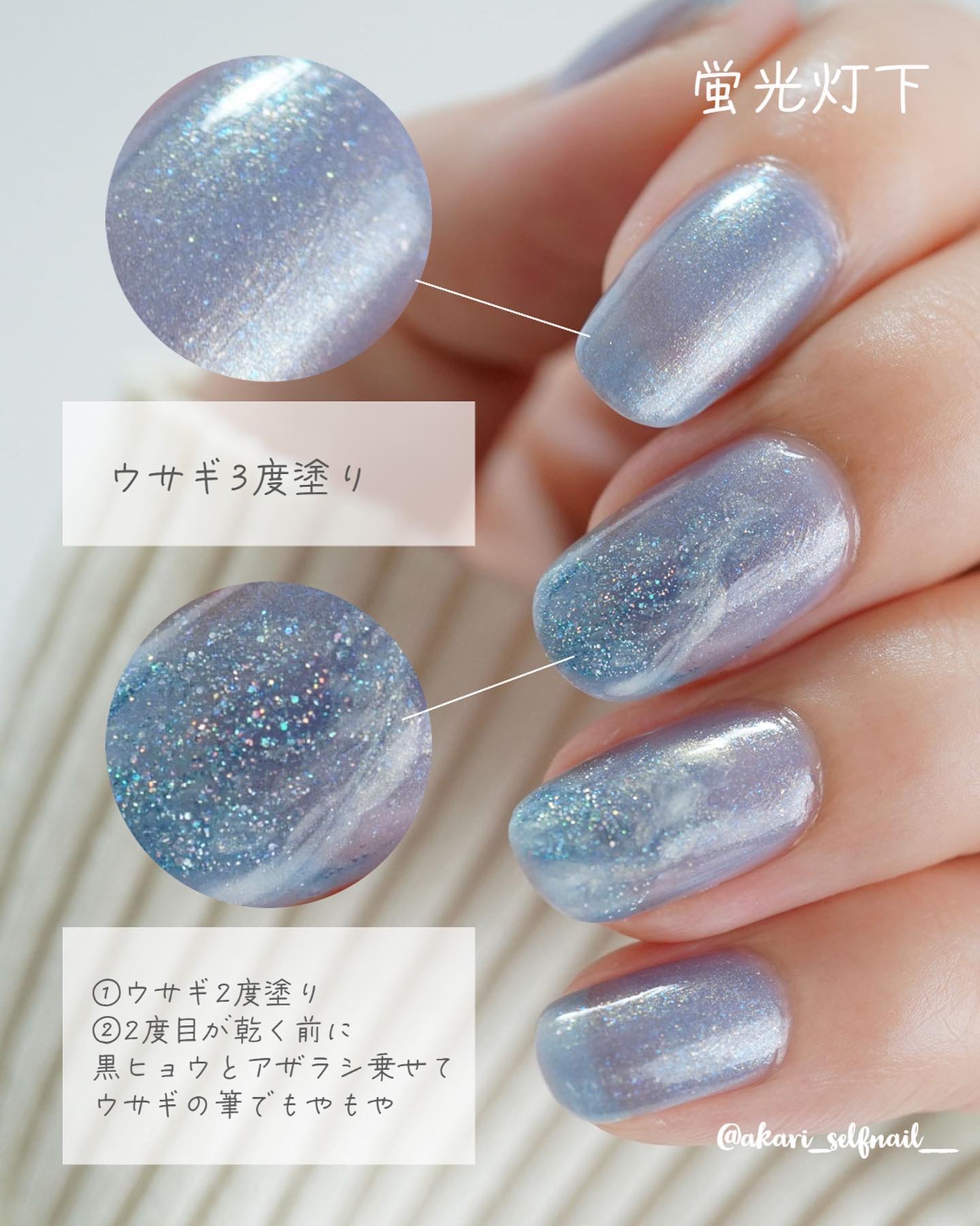ベースにフレークをふぁさっと乗せて乾かしたら 2色をランダムに塗り重ねるだけ。 シアーだからぼかし不要で ニュアンスっぽくなるのありがたい…🥹 室内でも外でもずっと眺めていられるような 美しいカラーでした✨ 色味もラメ感も好きすぎる💙