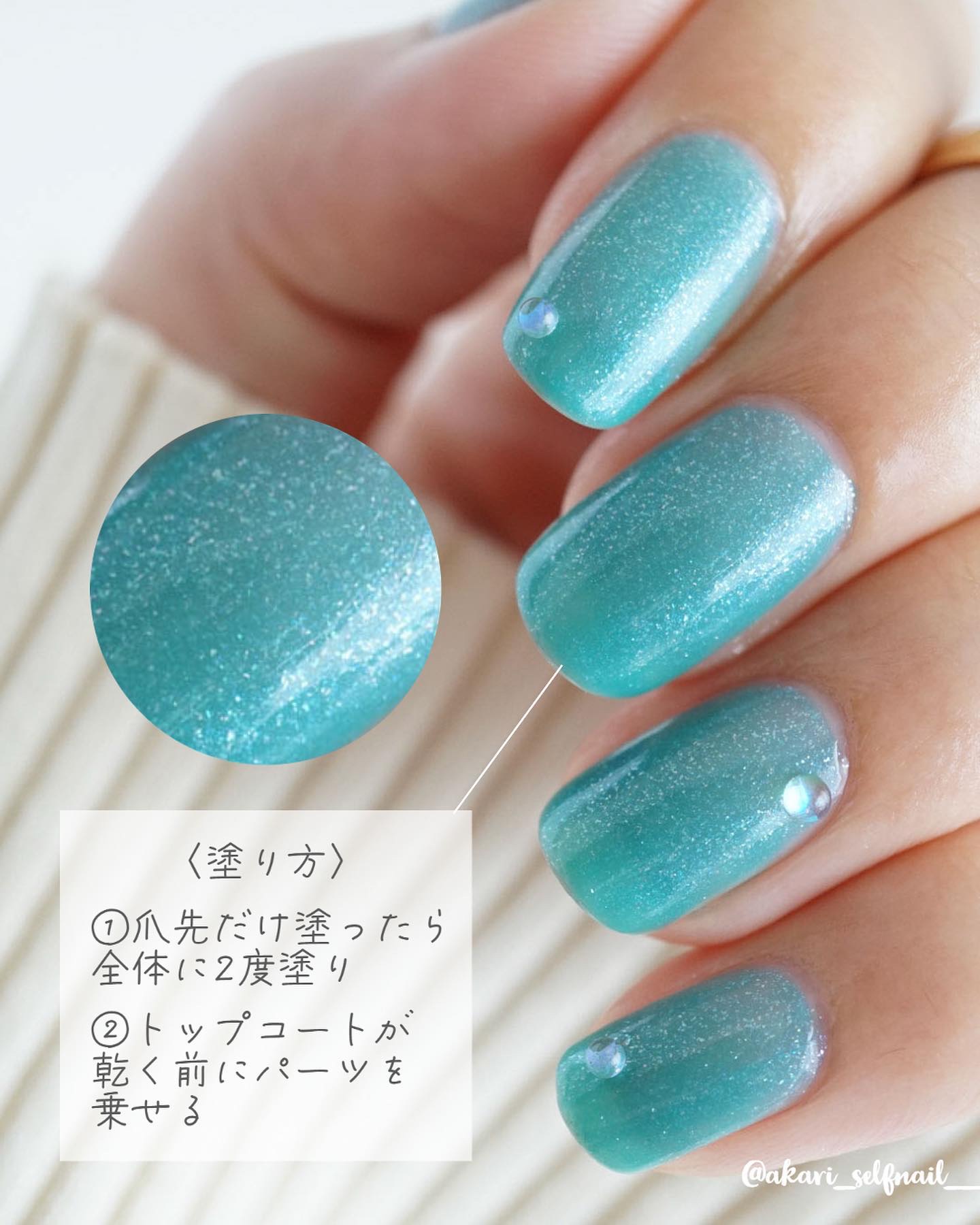 ベースにフレークをふぁさっと乗せて乾かしたら 2色をランダムに塗り重ねるだけ。 シアーだからぼかし不要で ニュアンスっぽくなるのありがたい…🥹 室内でも外でもずっと眺めていられるような 美しいカラーでした✨ 色味もラメ感も好きすぎる💙