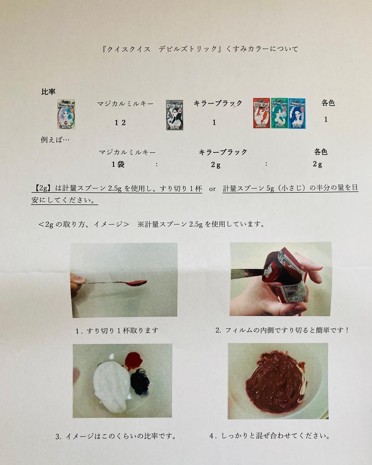 - <キラーブラック> 水、DPG、セタノール、セテアリルアルコール、水添ポリイソブテン、ジメチコン、セトリモニウムブロミド、グリセリン、シクロヘキサン-1,4-ジカルボン酸ビスエトキシジグリコール、ツバキ種子油、ホホバ種子油、イチョウ葉エキス、ミツロウ、セテス-40、PEG-90M、ステアルトリモニウムブロミド、イソプロパノール、エチドロン酸、乳酸、塩基性青99、塩基性茶16、紫401、塩基性赤76、塩基性黄57、HC黄4、HC青2、水酸化Na、エタノール、BG、香料 <ワイルドレッド> 水、DPG、セタノール、セテアリルアルコール、水添ポリイソブテン、ジメチコン、セトリモニウムブロミド、グリセリン、シクロヘキサン-1,4-ジカルボン酸ビスエトキシジグリコール、ツバキ種子油、ホホバ種子油、イチョウ葉エキス、ミツロウ、セテス-40、PEG-90M、ステアルトリモニウムブロミド、イソプロパノール、エチドロン酸、乳酸、塩基性赤51、塩基性橙31、HC赤3、水酸化Na、エタノール、BG、香料 <ムーンヴァイオレット> 水、DPG、セタノール、セテアリルアルコール、水添ポリイソブテン、ジメチコン、セトリモニウムブロミド、グリセリン、シクロヘキサン-1,4-ジカルボン酸ビスエトキシジグリコール、ツバキ種子油、ホホバ種子油、イチョウ葉エキス、ミツロウ、セテス-40、PEG-90M、ステアルトリモニウムブロミド、イソプロパノール、エチドロン酸、乳酸、HC青2、塩基性青9、HC青15、塩基性赤51、水酸化Na、エタノール、BG、香料 <マーメイドブルー> 水、DPG、セタノール、セテアリルアルコール、水添ポリイソブテン、ジメチコン、セトリモニウムブロミド、グリセリン、シクロヘキサン-1,4-ジカルボン酸ビスエトキシジグリコール、ツバキ種子油、ホホバ種子油、イチョウ葉エキス、ミツロウ、セテス-40、PEG-90M、ステアルトリモニウムブロミド、イソプロパノール、エチドロン酸、乳酸、HC青2、HC青16、塩基性赤51、水酸化Na、エタノール、BG、香料 <マジカルミルキー > 水、DPG、セタノール、セテアリルアルコール、水添ポリイソブテン、ジメチコン、セトリモニウムブロミド、グリセリン、シクロヘキサン-1,4-ジカルボン酸ビスエトキシジグリコール、ツバキ種子油、ホホバ種子油、イチョウ葉エキス、ミツロウ、セテス-40、PEG-90M、ステアルトリモニウムブロミド、イソプロパノール、エチドロン酸、乳酸、水酸化Na、エタノール、BG、香料 <キャンディピンク> 水、DPG、セタノール、セテアリルアルコール、水添ポリイソブテン、ジメチコン、セトリモニウムブロミド、グリセリン、シクロヘキサン-1,4-ジカルボン酸ビスエトキシジグリコール、ツバキ種子油、ホホバ種子油、イチョウ葉エキス、ミツロウ、セテス-40、PEG-90M、ステアルトリモニウムブロミド、イソプロパノール、エチドロン酸、乳酸、塩基性赤51、水酸化Na、エタノール、BG、香料 <キャプテンターコイズ> 水、DPG、セタノール、セテアリルアルコール、水添ポリイソブテン、ジメチコン、セトリモニウムブロミド、グリセリン、シクロヘキサン-1,4-ジカルボン酸ビスエトキシジグリコール、ツバキ種子油、ホホバ種子油、イチョウ葉エキス、ミツロウ、セテス-40、PEG-90M、ステアルトリモニウムブロミド、イソプロパノール、エチドロン酸、乳酸、酸化チタン、塩基性青99、HC青15、HC青16、黄203、水酸化Na、水酸化Al、エタノール、BG、香料 <サーフィンオレンジ> 水、DPG、セタノール、セテアリルアルコール、水添ポリイソブテン、ジメチコン、ベヘントリモニウムメトサルフェート、グリセリン、シクロヘキサン-1,4-ジカルボン酸ビスエトキシジグリコール、ツバキ種子油、ホホバ種子油、イチョウ葉エキス、ミツロウ、セテス-40、PEG-90M、エチドロン酸、乳酸、HC黄2、塩基性橙31、塩基性黄87、水酸化Na、BG、香料