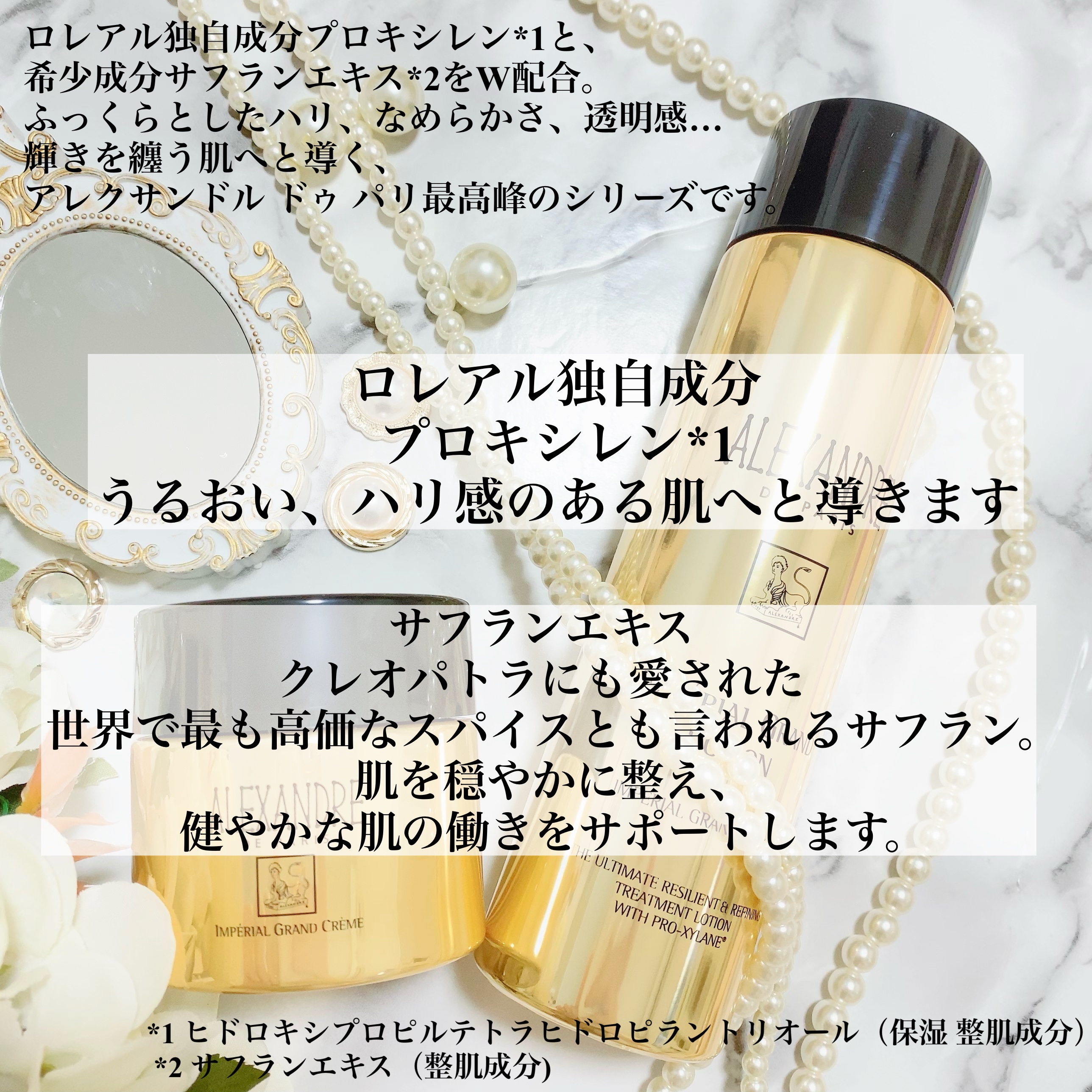 アレクサンドル ドゥ パリといったら、ヘアアクセサリーに憧れていたけどスキンケアがあるなんて今回ご縁をいただいて初めて知りました🫢💕 リッチ感漂うゴールドのボトルが印象的✨ ロレアル独自成分のプロキシレン*1とクレオパトラにも愛された世界で最も高価なスパイスとも言われるサフランエキス*2をW配合!! 💛アンペリエルグランローションとろみもあるけどさらさらなテクスチャー。馴染みも早くほんとしっっとりする!!ベタつかないので朝晩使える! 💛アンペリエルグランクレーム濃厚なこっくりとしたテクスチャー。これがアレクサンドル ドゥ パリ最高峰か✨✨と思うほどかなり濃密でリッチな質感。お肌に広げるとなめらかで伸びが良くて、ベタつかない◎ふっくらもちもち感のある印象に。 両方とも高貴で上品な香りがしてリッチな気分になれます✨香りの強さは少々強めなので好みは分かれるかも🤔
