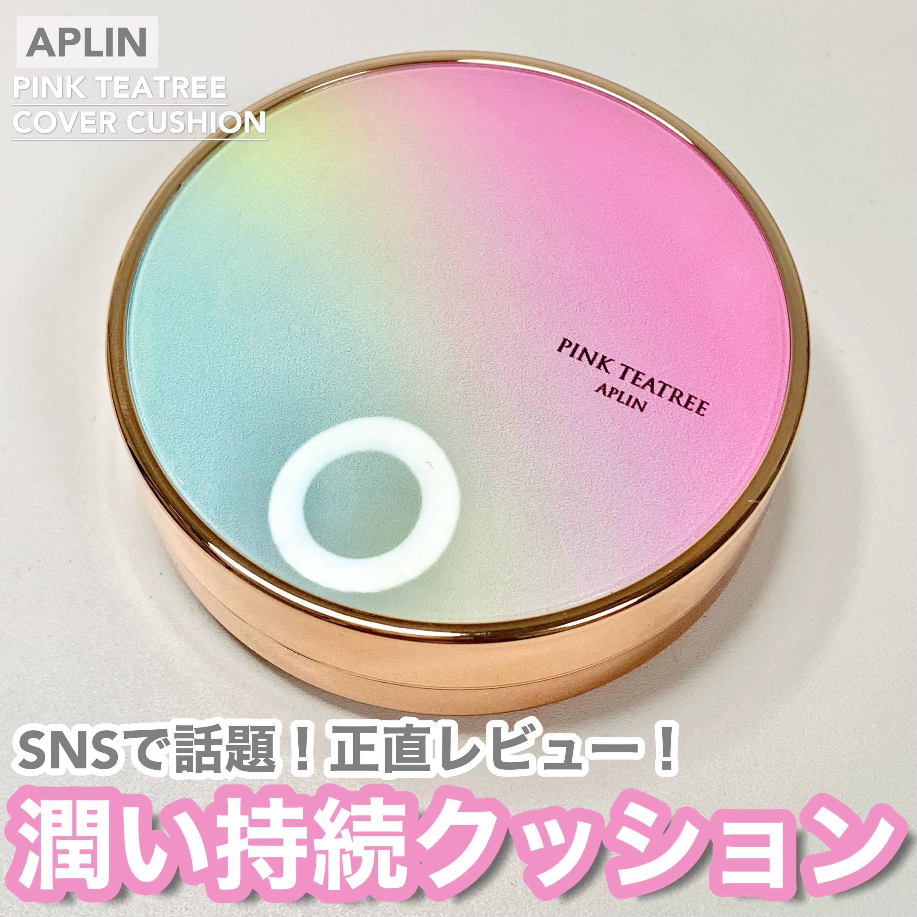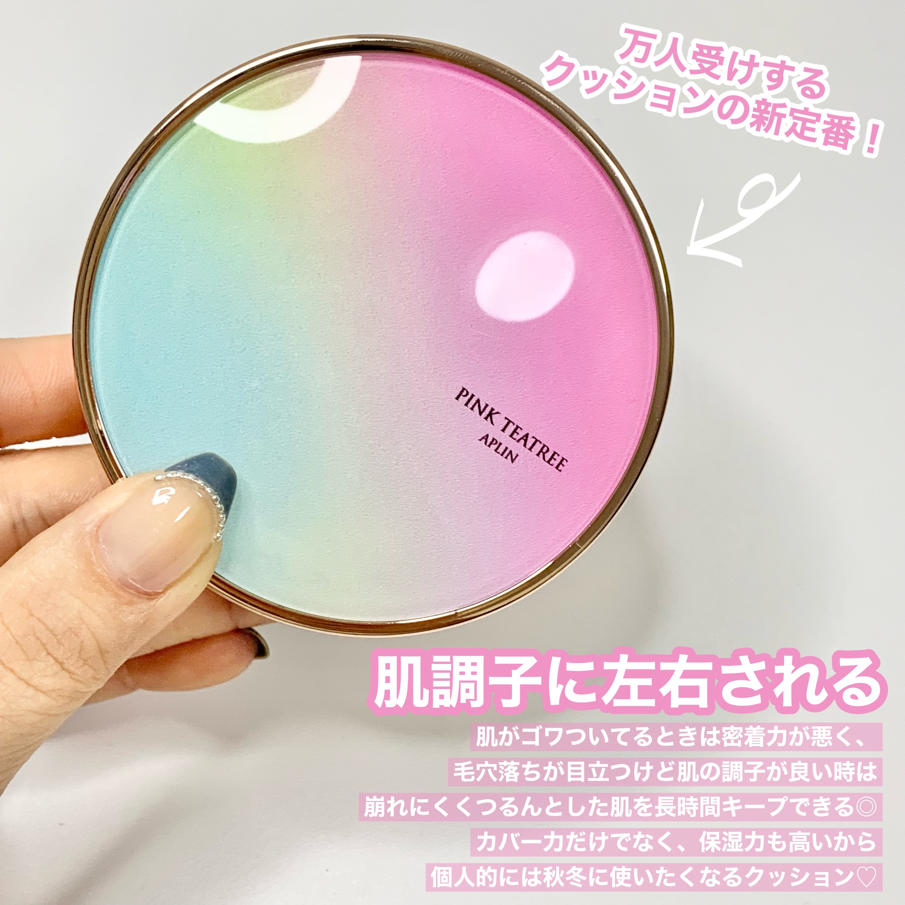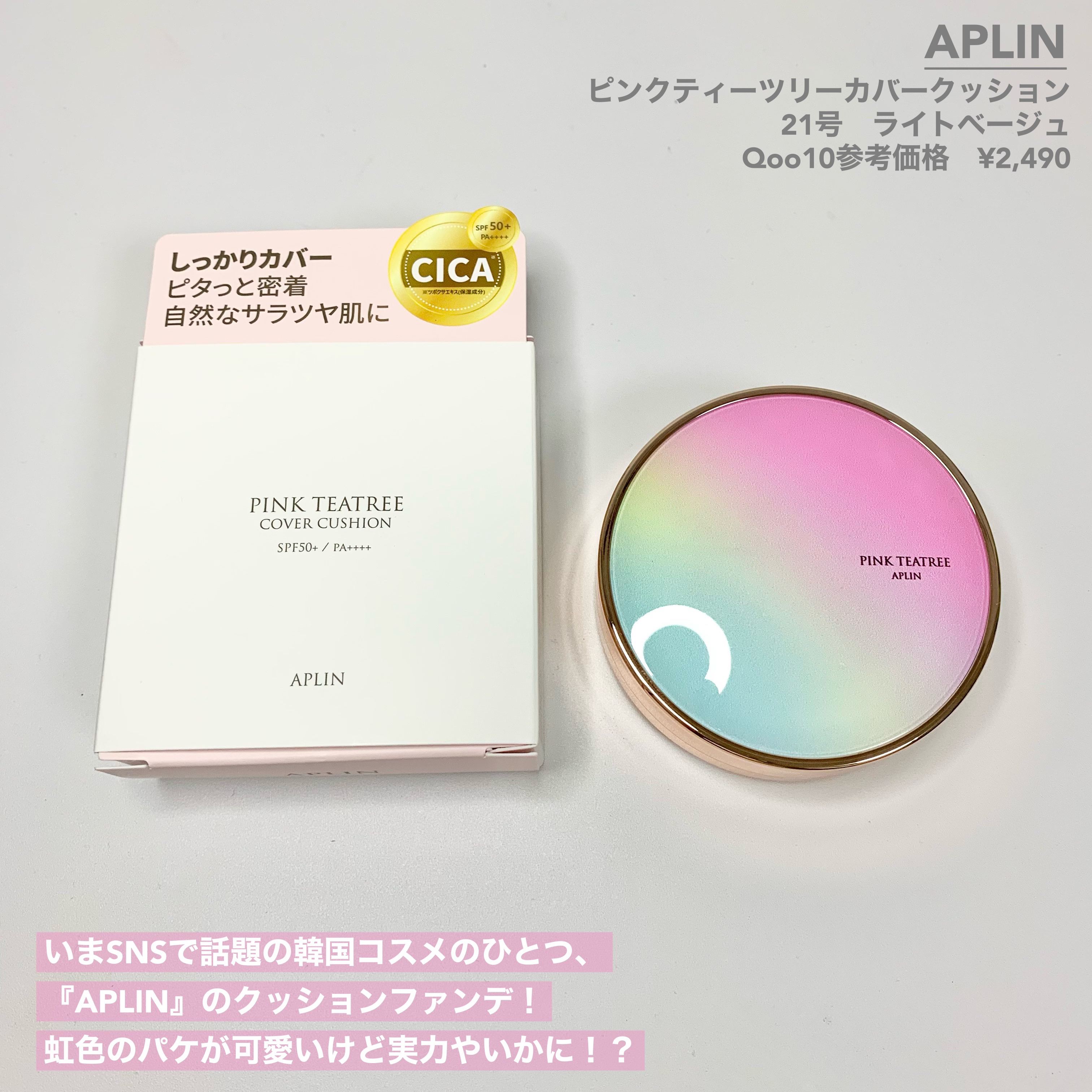 APLIN ピンクティーツリーカバークッション 21号ライトベージュ 2,490円(税込) 少量でよく伸びてハイカバー! 赤みやくすみをしっかりカバ一できるのに、厚塗り感のないなめらかな仕上がり♡ ハイカバーなのにナチュラルなツヤ感とサラッとしつつ、乾燥崩れしにくい仕上がりに感動します!!